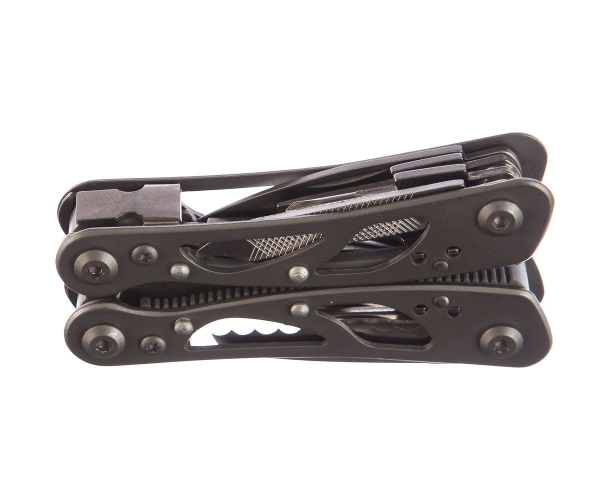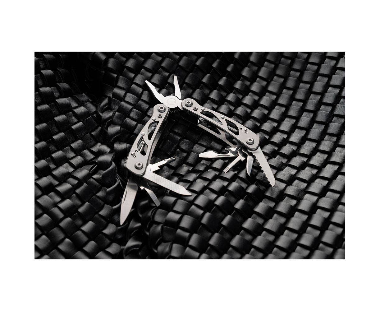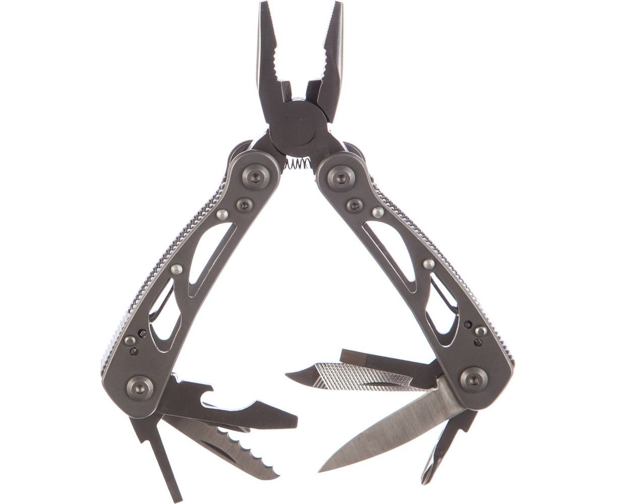 В комплект мультитула G104 S входят следующие инструменты: подпружиненные плоскогубцы с кусачками, два лезвия, одно из которых имеет серрейторную заточку, две плоских и одна крестообразная отвертки среднего размера, шило, небольшой напильник, паз для снятия изоляции с проводов, открывалка для бутылок и консервный нож. Все инструменты выполнены из нержавеющей стали 440С, которая имеет высокие эксплуатационные характеристики.