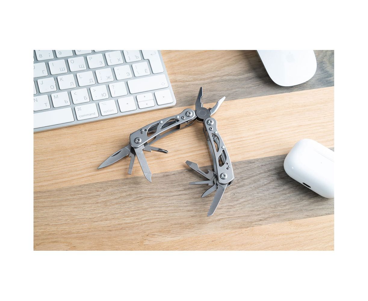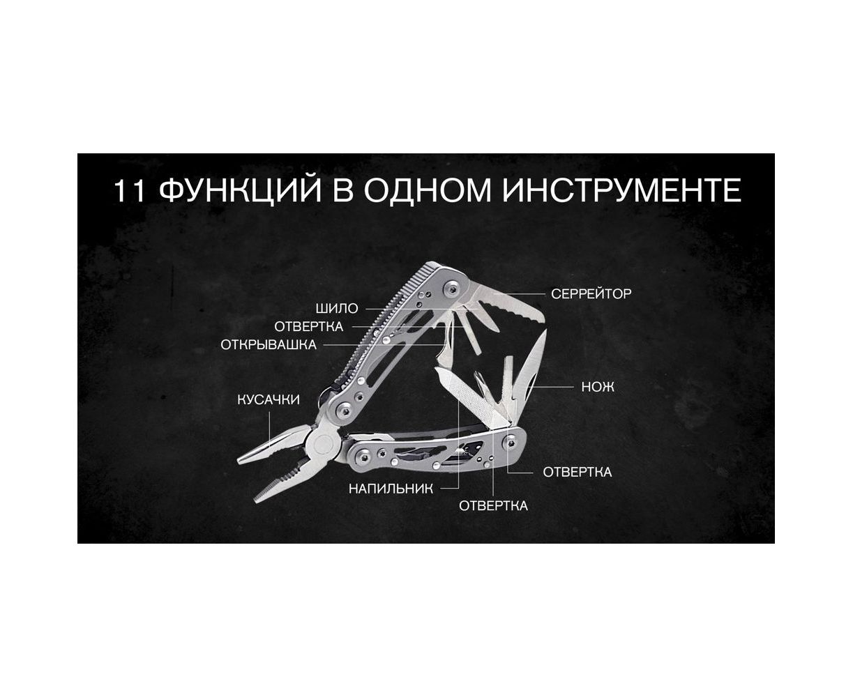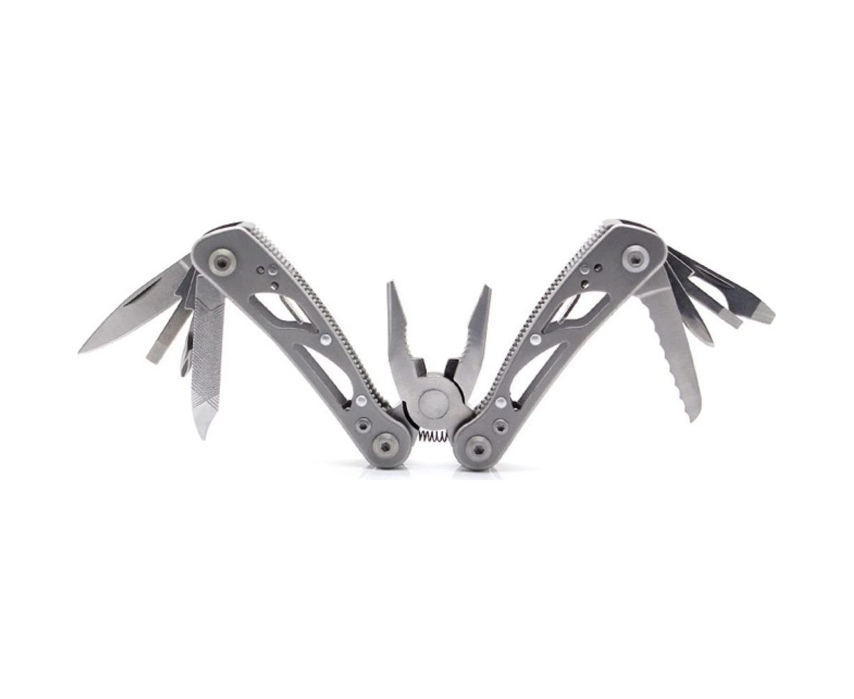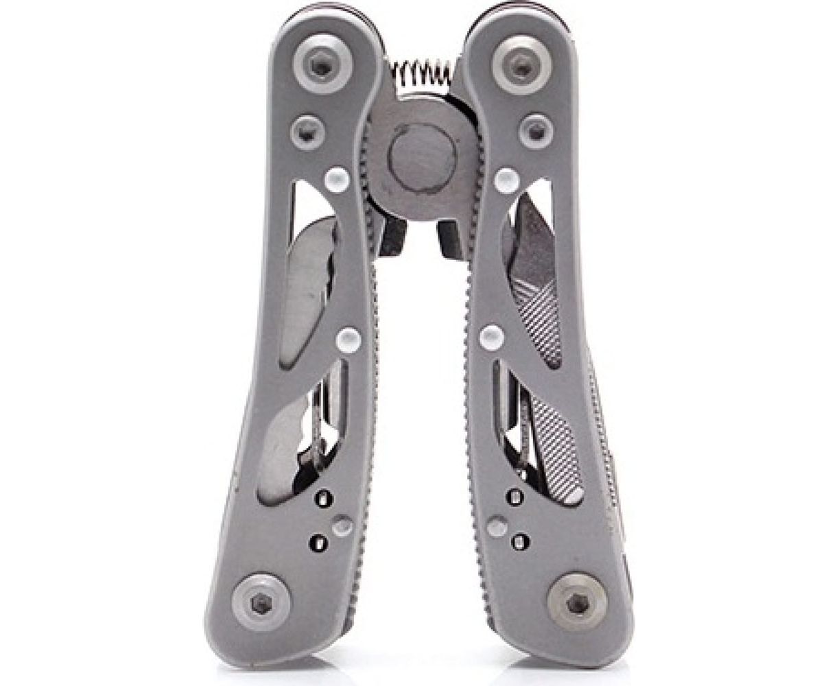 В комплект мультитула G104 S входят следующие инструменты: подпружиненные плоскогубцы с кусачками, два лезвия, одно из которых имеет серрейторную заточку, две плоских и одна крестообразная отвертки среднего размера, шило, небольшой напильник, паз для снятия изоляции с проводов, открывалка для бутылок и консервный нож. Все инструменты выполнены из нержавеющей стали 440С, которая имеет высокие эксплуатационные характеристики.