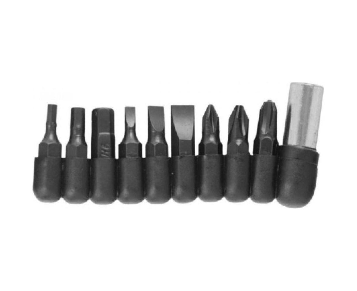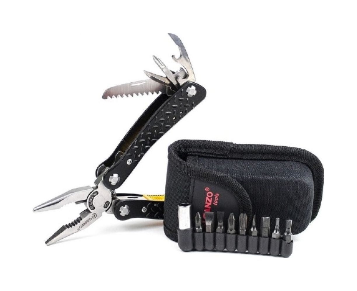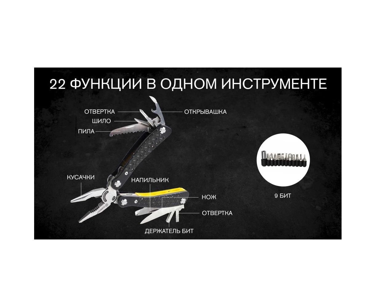 Инструмент данной модели укомплектован небольшими ножами с обыкновенной и серрейторной заточкой, острым шилом, открывалками для бутылок и консервных банок, прямой и крестовой отвертками. Более того, целый набор бит разной формы и размера прилагается в комплект к мультитулу дополнительно. Они крепятся с помощью магнитного переходника, позволяющего надежно зафиксировать каждую из насадок. Хранятся биты в общем чехле, каждая — в своей собственной ячейке.