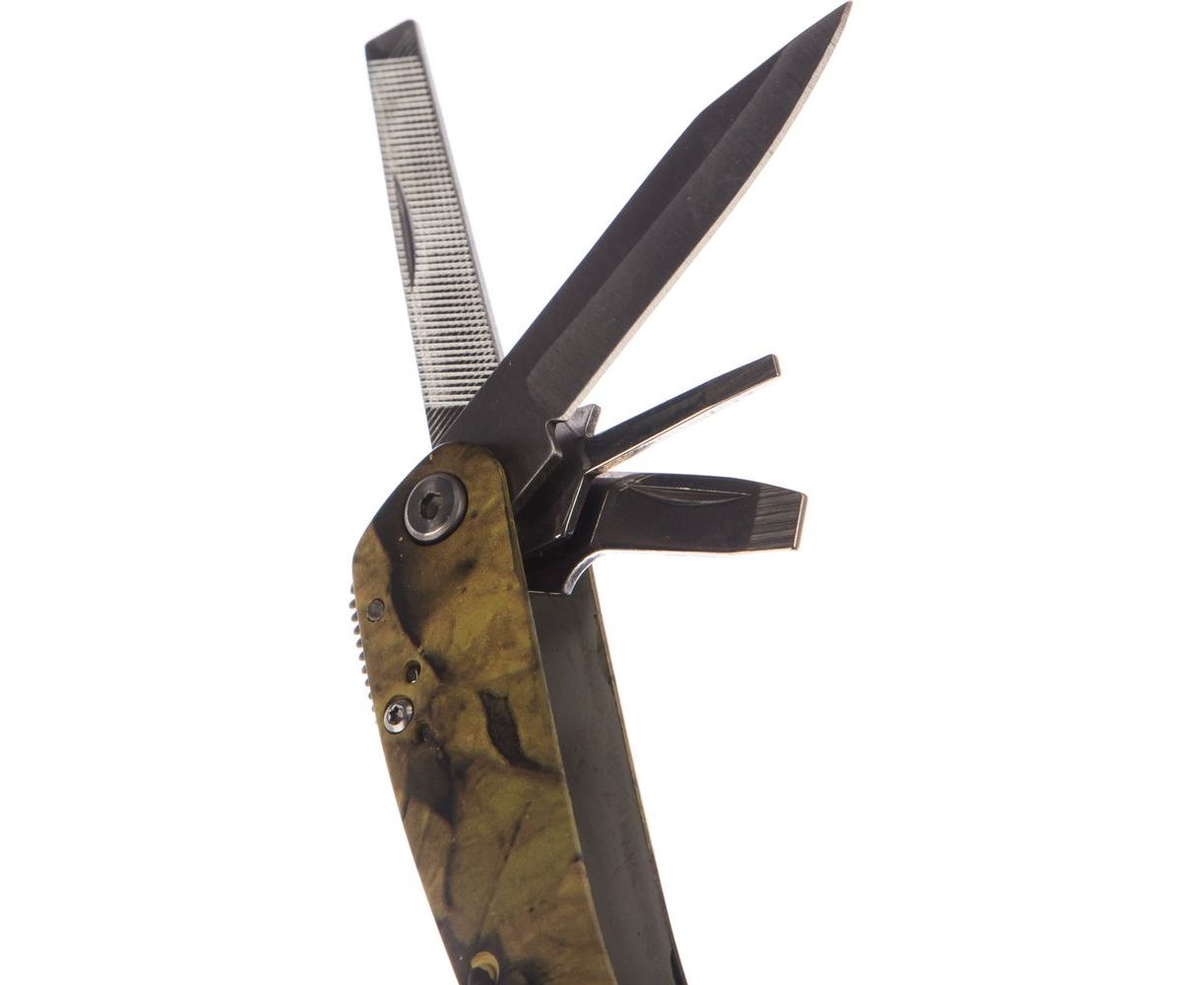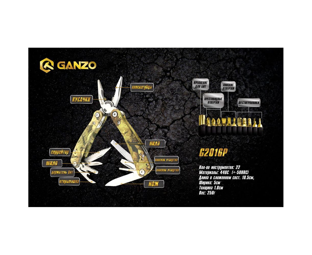 На ручках мультитула G2016-P закреплены пластиковые накладки, имеющие камуфлирующую окраску. В комплекте инструментов находятся: подпружиненные плоскогубцы с кусачками, два лезвия, одно из которых имеет серрейторную заточку, две шлицевых отвертки разного размера, напильник, линейка, удлинитель адаптера для бит, нож для консервов и открывалка для бутылок.