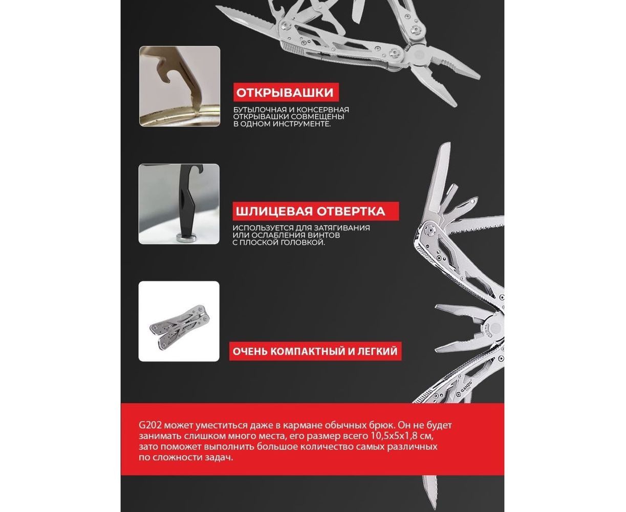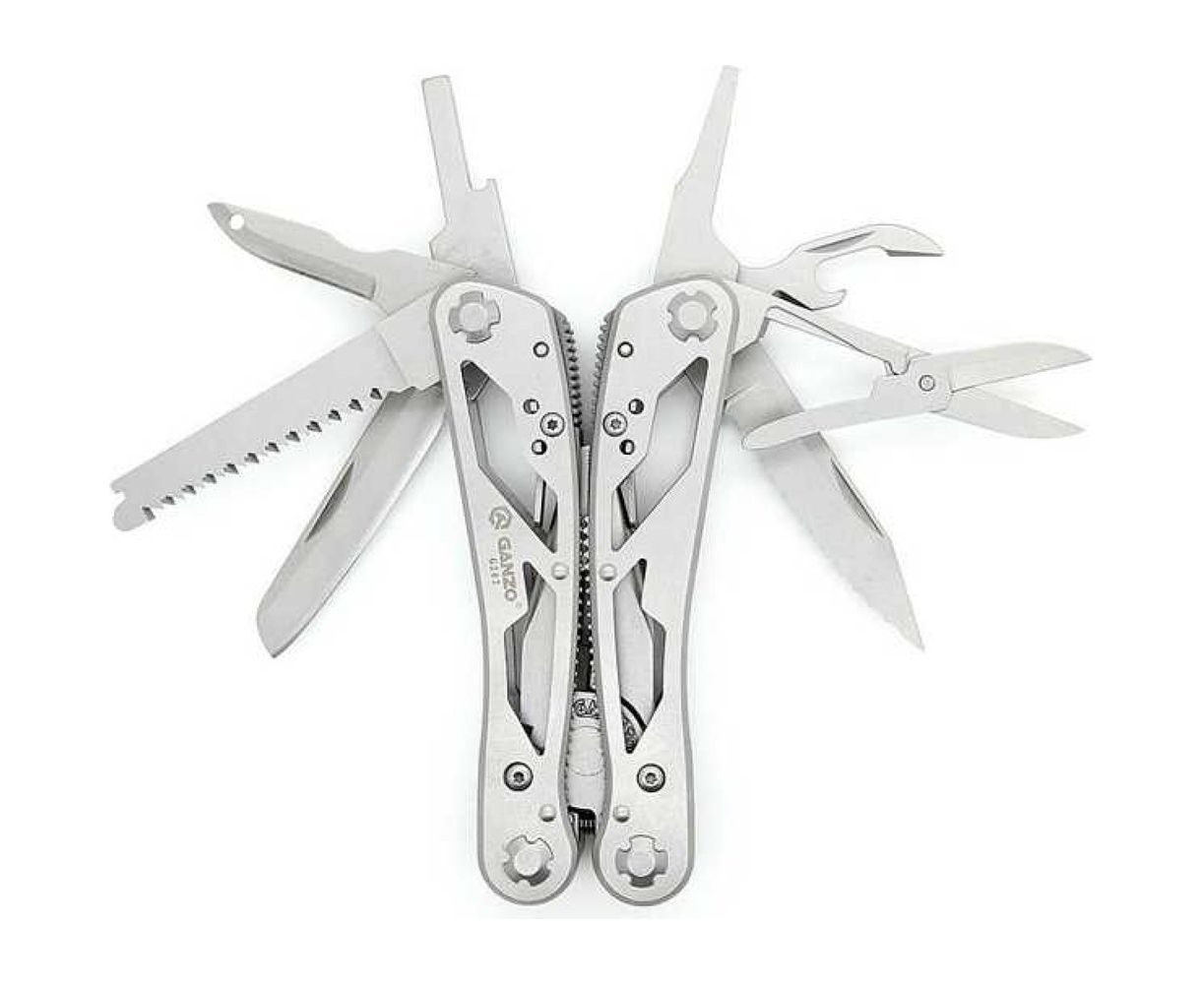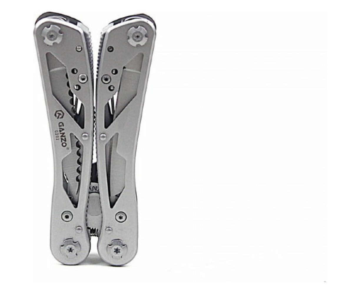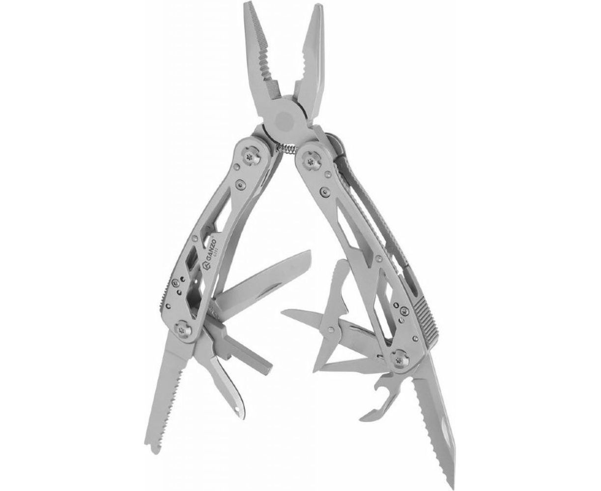 Стильный мультитул G202 от компании Ganzo. Модель имеет продуманный дизайн и большой набор инструментов. В комплект входят следующие предметы: подпружиненные плоскогубцы с кусачками, два лезвия, одно из которых имеет серрейторную заточку, плоская отвертка небольшого размера, ножницы, ножовка по дереву, зенковка, удлинитель адаптера для бит открывалки для бутылок и консервов.