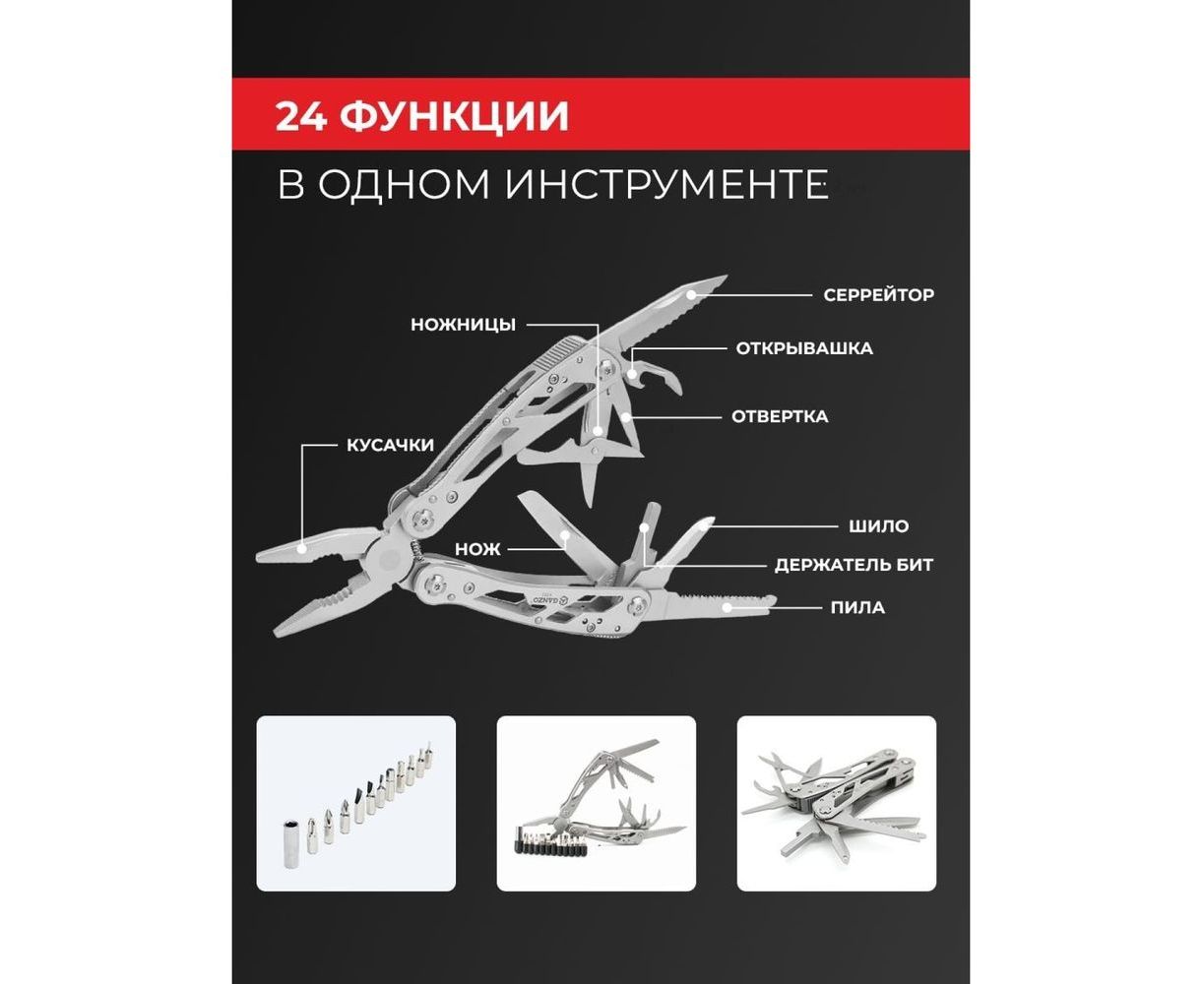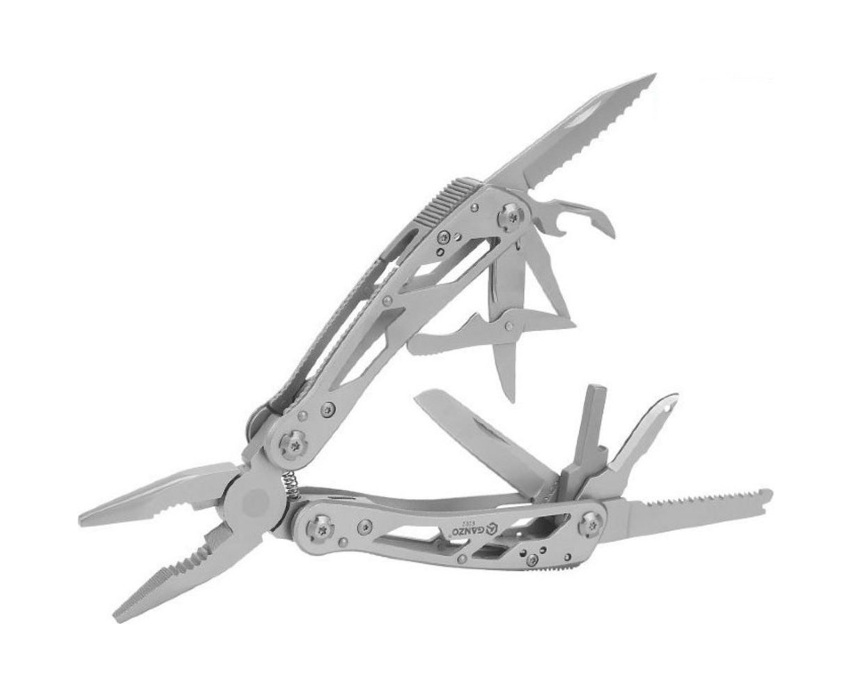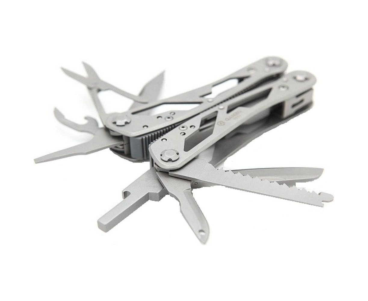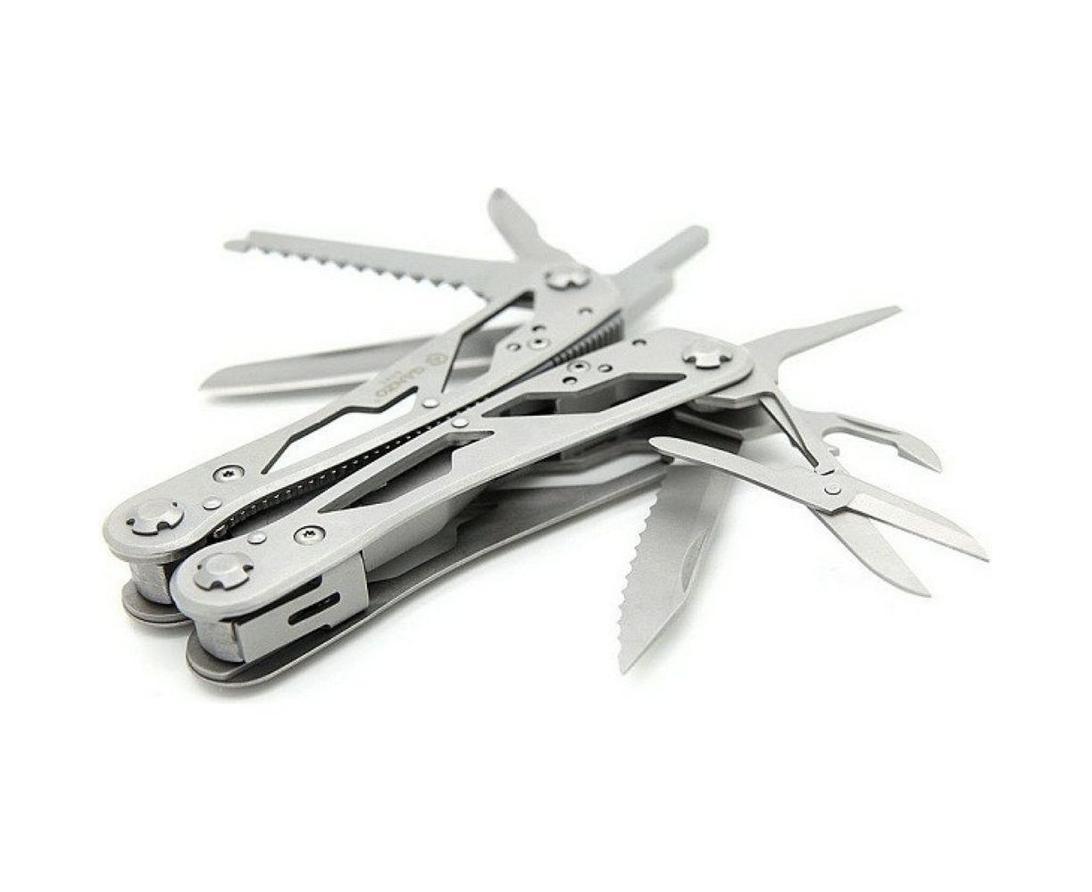 Стильный мультитул G202 от компании Ganzo. Модель имеет продуманный дизайн и большой набор инструментов. В комплект входят следующие предметы: подпружиненные плоскогубцы с кусачками, два лезвия, одно из которых имеет серрейторную заточку, плоская отвертка небольшого размера, ножницы, ножовка по дереву, зенковка, удлинитель адаптера для бит открывалки для бутылок и консервов.