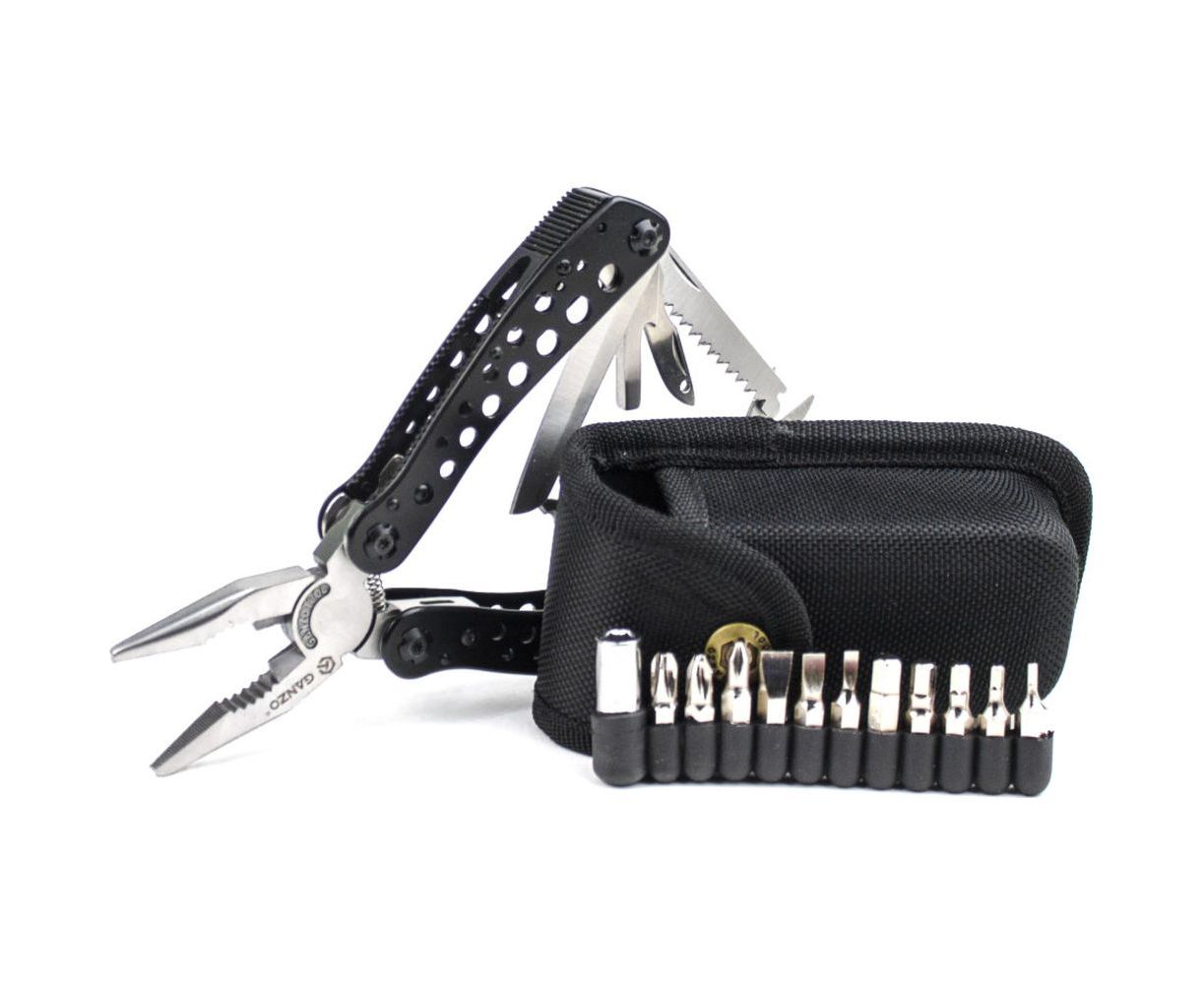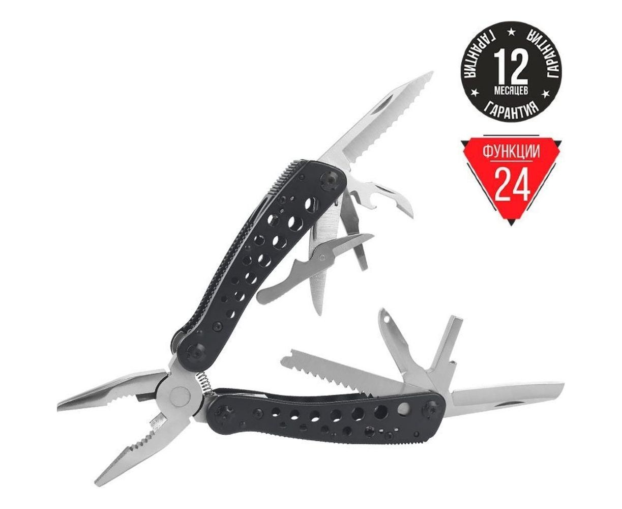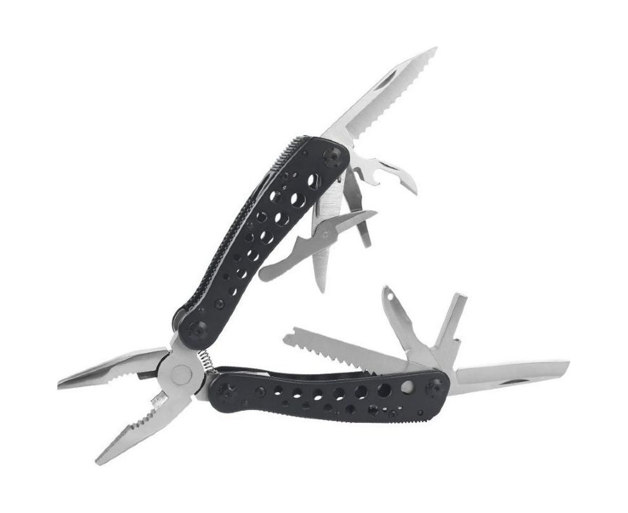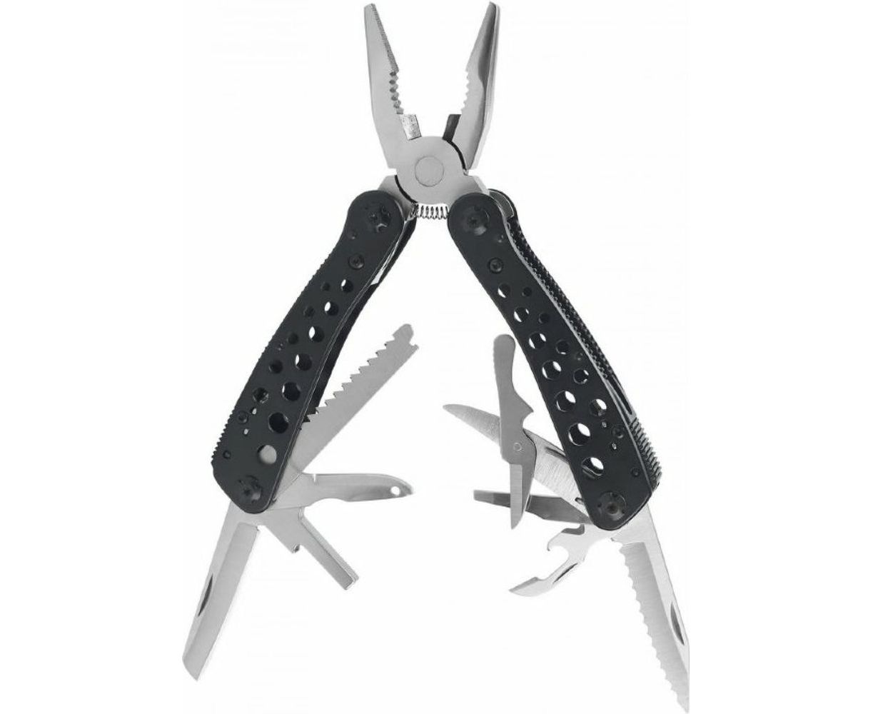 Его центральный инструмент — это мощные плоскогубцы с кусачками и захватом для гаек или других круглых предметов. Плоскогубцы подпружинены, поэтому, когда инструмент готов к работе, они всегда будут оставаться в открытом состоянии. Также в рукоятках размещены дополнительные инструменты, которые пригодятся и для ремонта, и для выполнения других необходимых во время отдыха на природе работ. Это ножи с прямым и серрейторным лезвием, небольшие подпружиненные ножницы, пила, шило, отвертка с прямым шлицем, открывалка для консервов. Помимо того, в отдельном резиновом блистере размещены дополнительные биты для отвертки: пять шестигранных, по три прямые и крестовидные, а также — магнитный переходник. Все инструменты мультитула изготовлены из стали 440С.