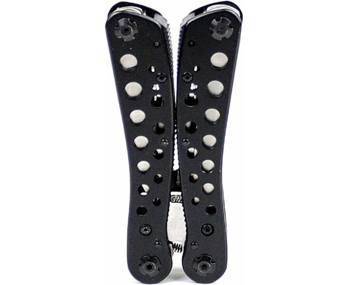 Рукоятки мультитула тоже сделаны из металла и покрыты черной краской, которая не стирается со временем. Поверхность накладок украшена при помощи круглых отверстий, которые, одновременно, помогают снизить вес инструмента.