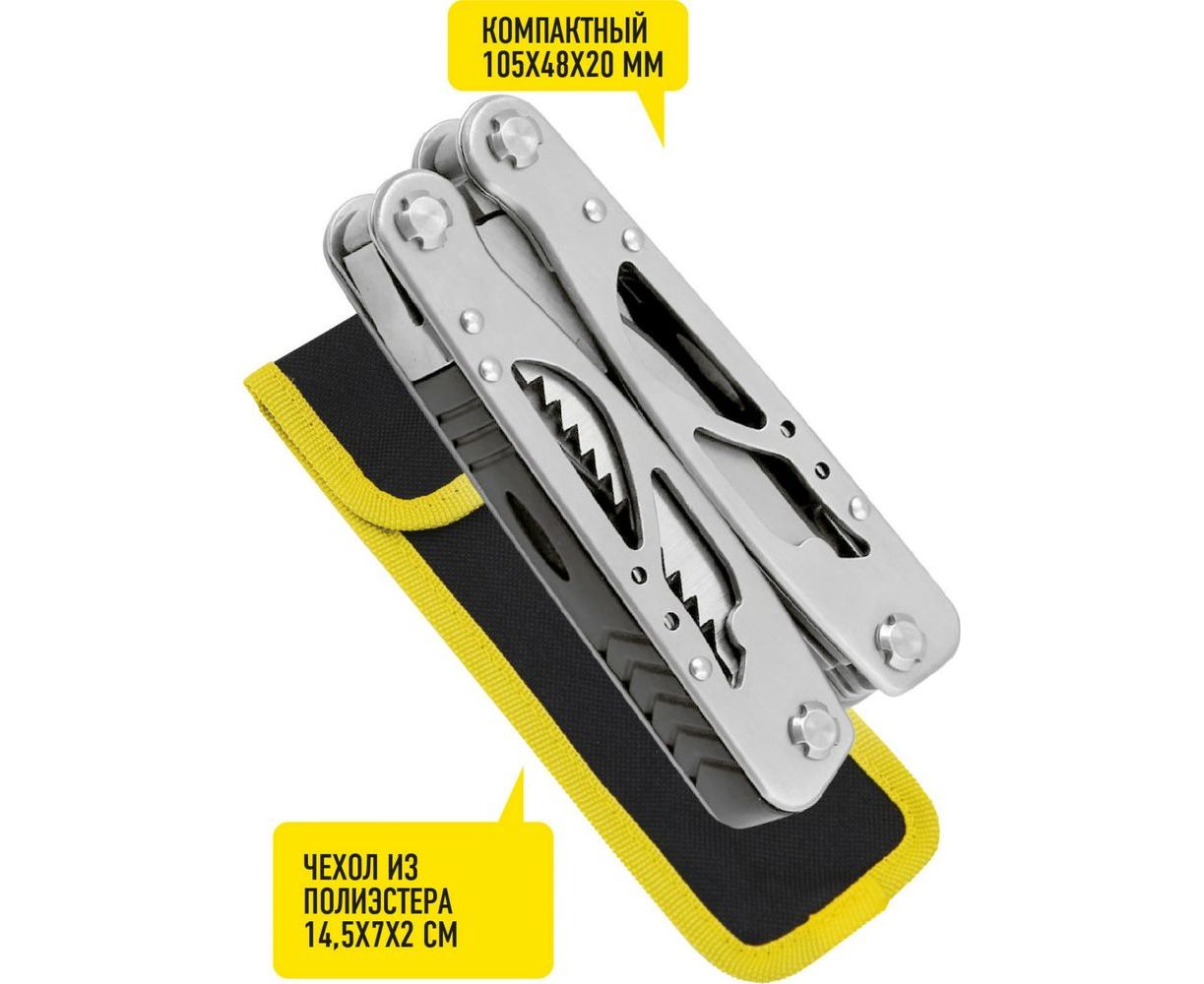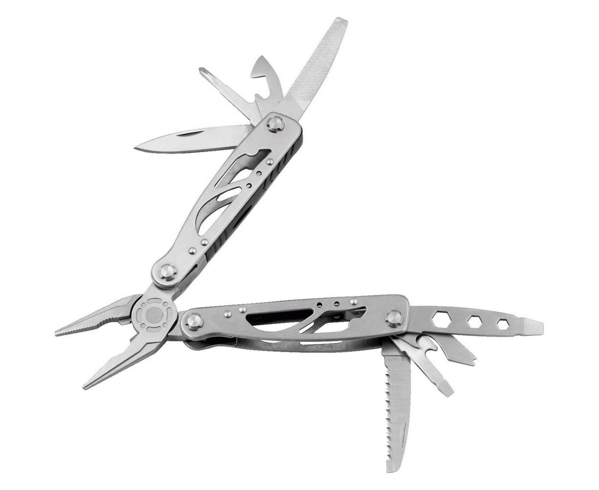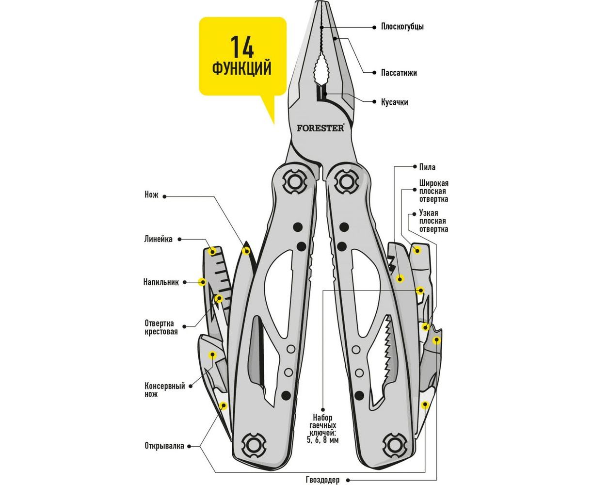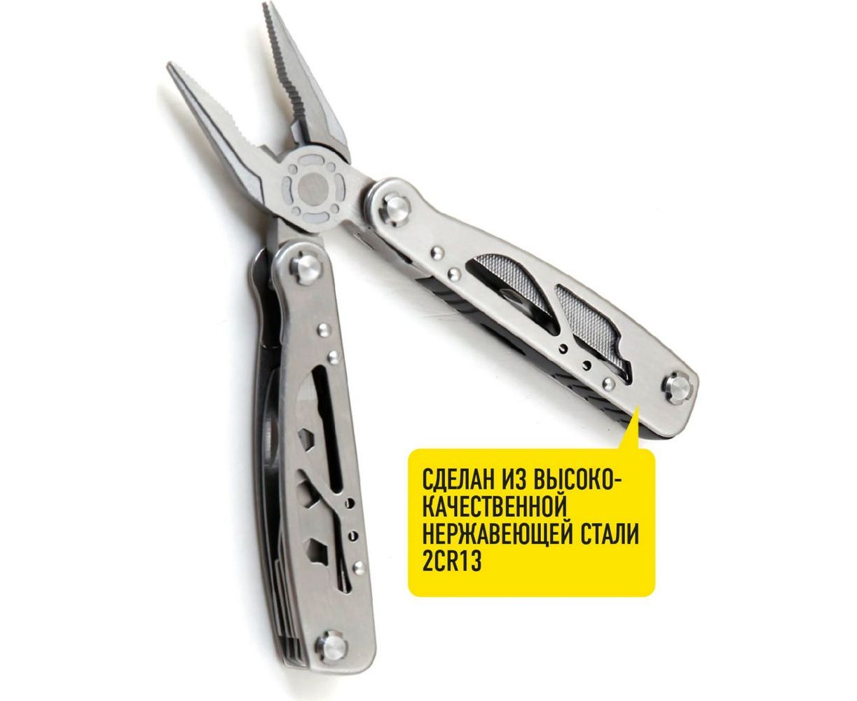 Многофункциональный инструмент, который включает 14 функций: плоскогубцы; пассатижи; кусачки для проволоки; нож; отвертка крестовая; напильник; линейка; консервный нож; пила; узкая плоская отвертка; открывалка для бутылки; гвоздодер; широкая плоская отвертка; набор гаечных ключей: 5, 6, 8 мм.