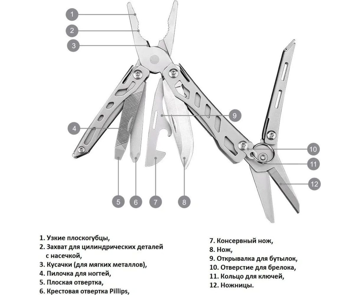 нож прямой, ножницы, острогубцы, отвертка плоская, отвертка крестовая, открывалка для бутылок, открывалка для консервов, пилка для ногтей