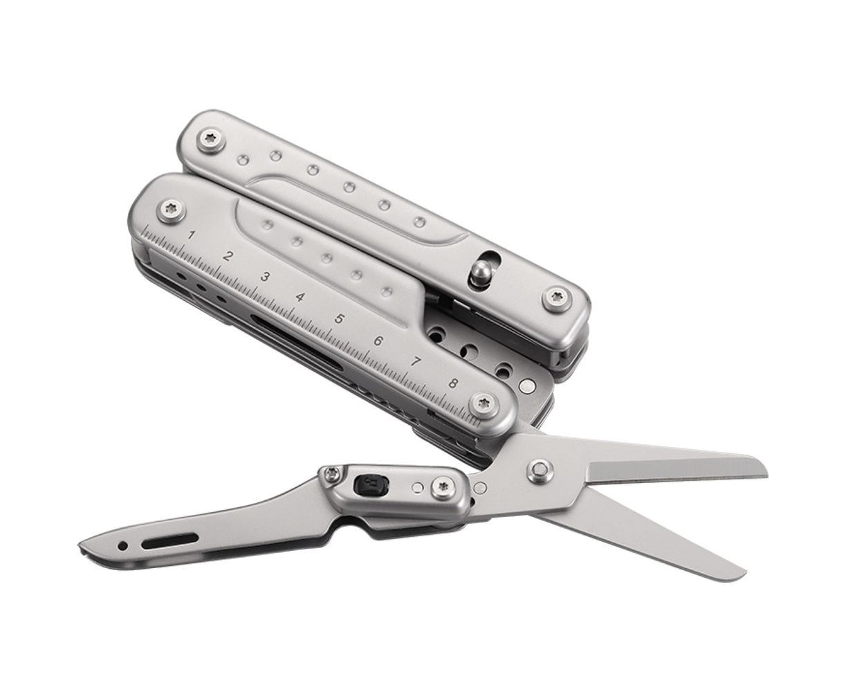 Открывать инструменты можно буквально одной рукой, что быстро и удобно. За одно движение можно извлечь и применить сразу 7 часто используемых функций, и сделать это легко, даже будучи в перчатках. Ножницы модели достаточно велики и безопасны, с ними достаточно просто работать, и можно перерезать довольно толстые верёвки или канаты. Рукоять у ножниц имеет замок-переключатель для устойчивой работы инструментом. Форма лезвия ножа в мультитуле – Tanto, нож нуждается в приобретении дополнительно различных лезвий. Можно выполнять самые разные работы, используя для них тот или иной тип клинка, и оптимизируя тем самым процесс.