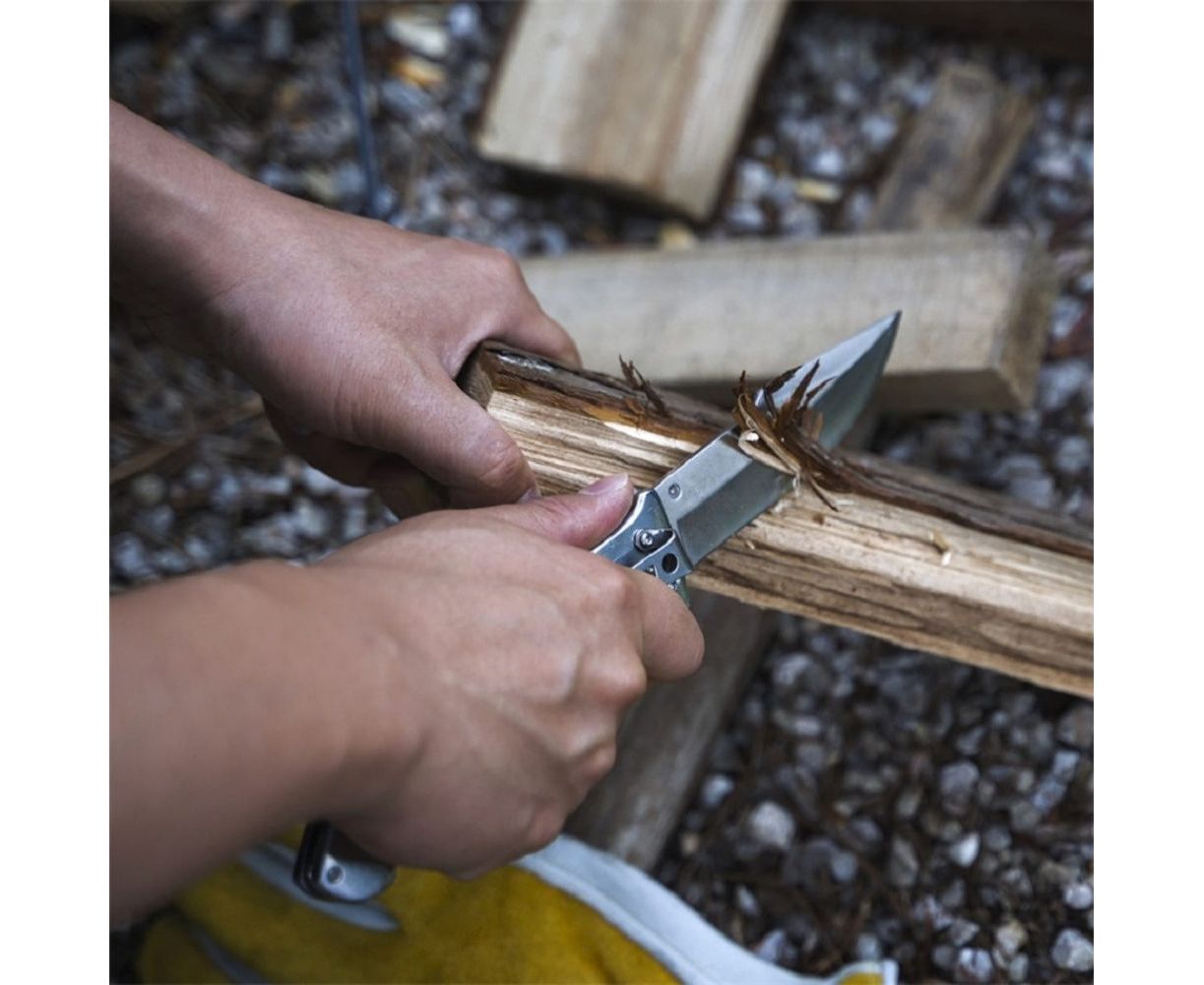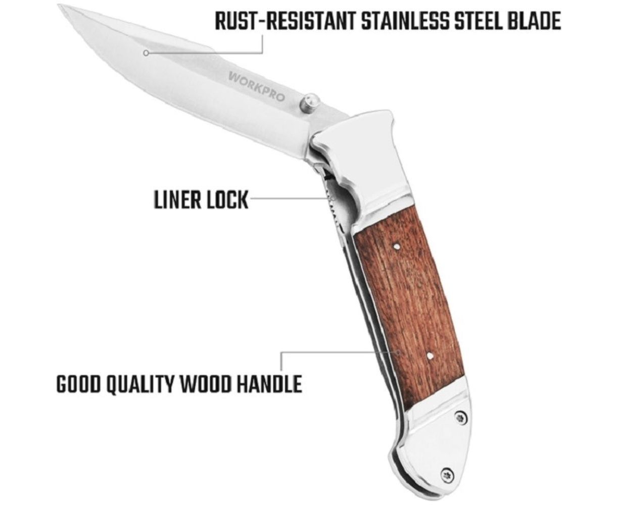 Складной нож из нержавеющей стали с деревянными накладками на ручке.