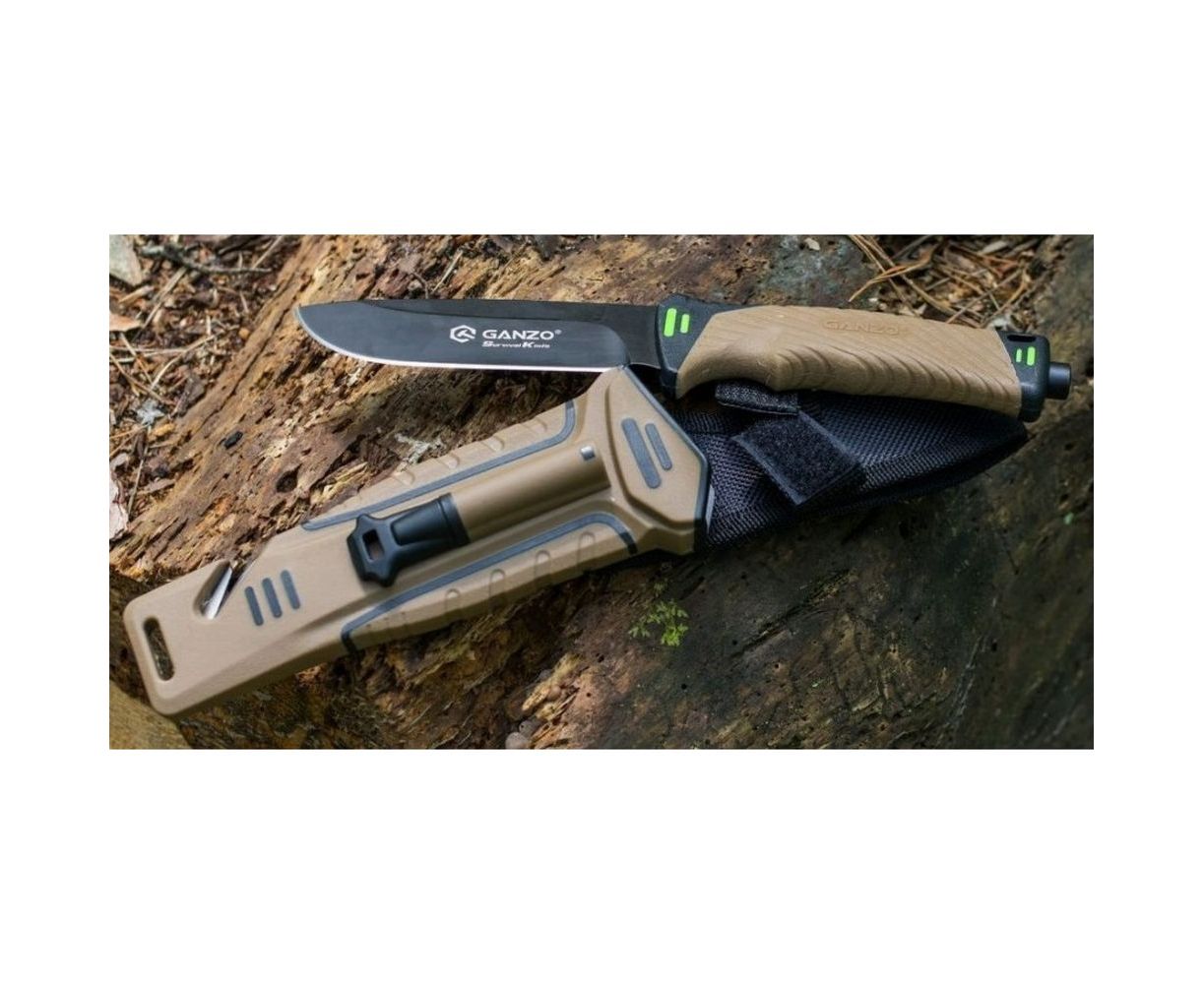 Туристический нож Ganzo G8012 DY позиционируется как нож для выживания. Изготовлен из стали 7Cr17 , благодаря чему хорошо держит заточку и легко правится на металлической пластине с алмазным напылением, которая встроена с обратной стороны чехла. Также в ножнах размещен стропорез, а в специальном гнезде - огниво. На конце рукоятки предусмотрен стеклобой. Яркая отделка ножа не позволяет ему потеряться на любой поверхности. Черная окраска лезвия имеет тактическое назначение, а так же дополнительно защищает клинок от коррозии.
