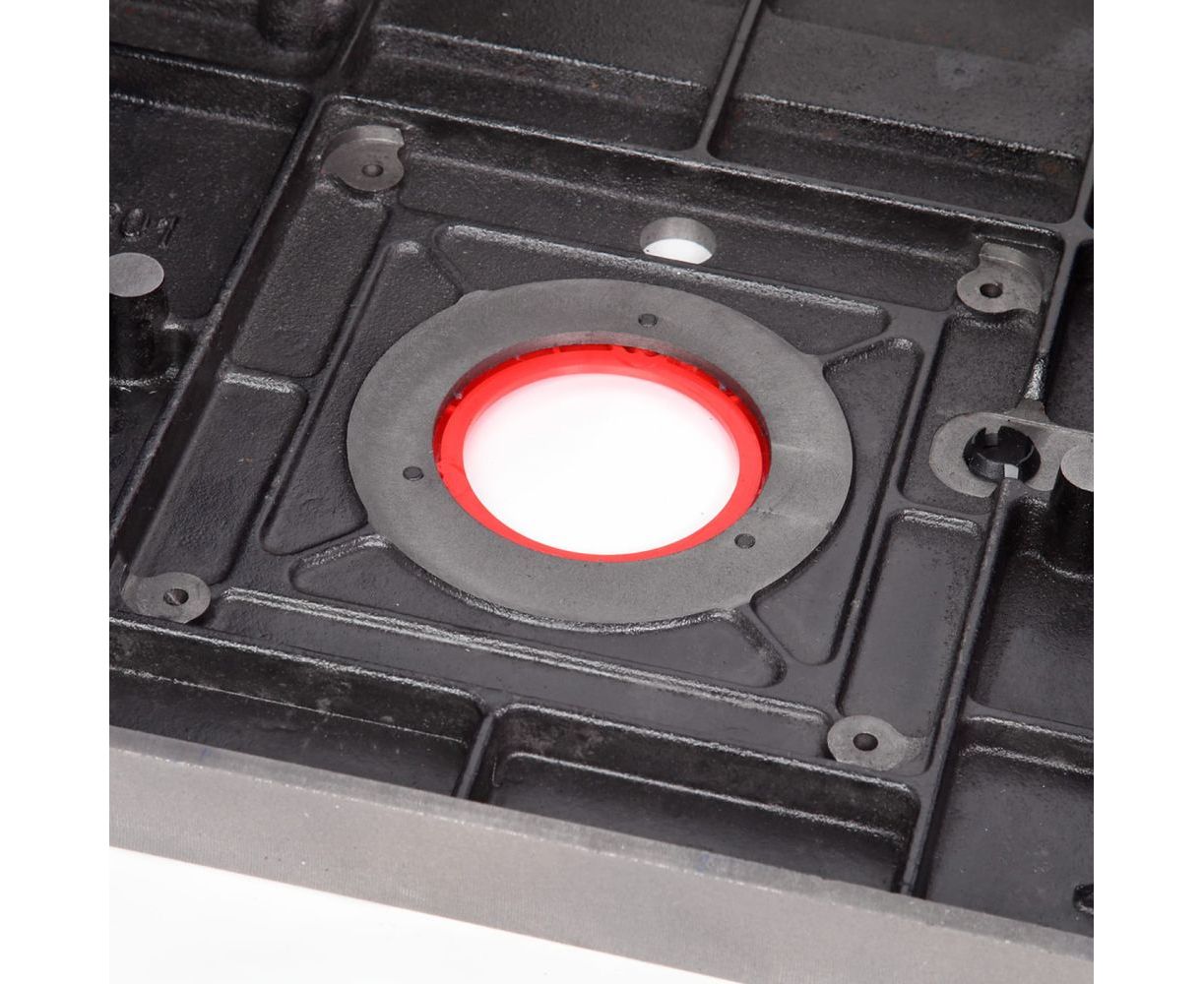 Имеется два отверстия для регулировки высоты вылета фрезы: первое - общего плана под пластину №1, второе - под пластину для лифта BELMASH D033A. Основной и дополнительные столы имеют паз под установку углового упора (-60...+60 град.).