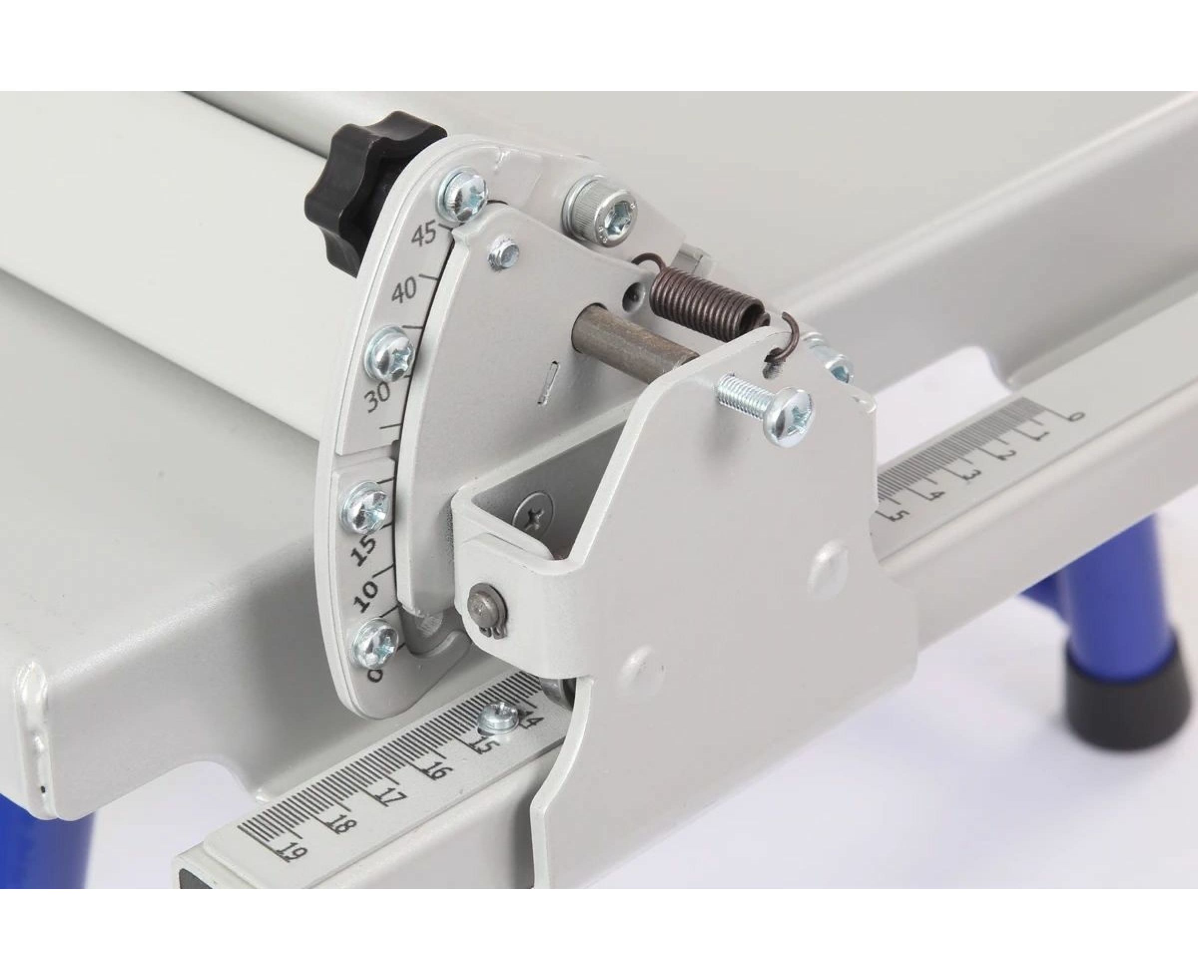 Угловой упор и система наклона пильного диска (0÷45°) позволяют совершать точные пропилы под углом. Угловой упор устанавливается в специальный паз слева от пильного диска и позволяет распиливать заготовку под углом в диапазоне от -45° до +45°. С целью предотвращения заклинивания пильного диска имеется расклинивающий нож с защитным кожухом. Для безопасной работы с короткими и узкими заготовками используется толкатель, который крепится под пильным столом.