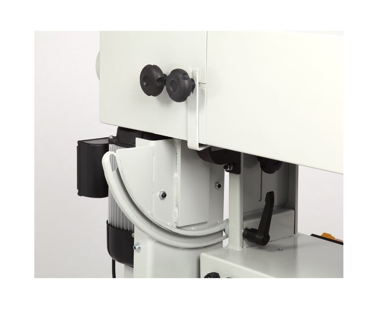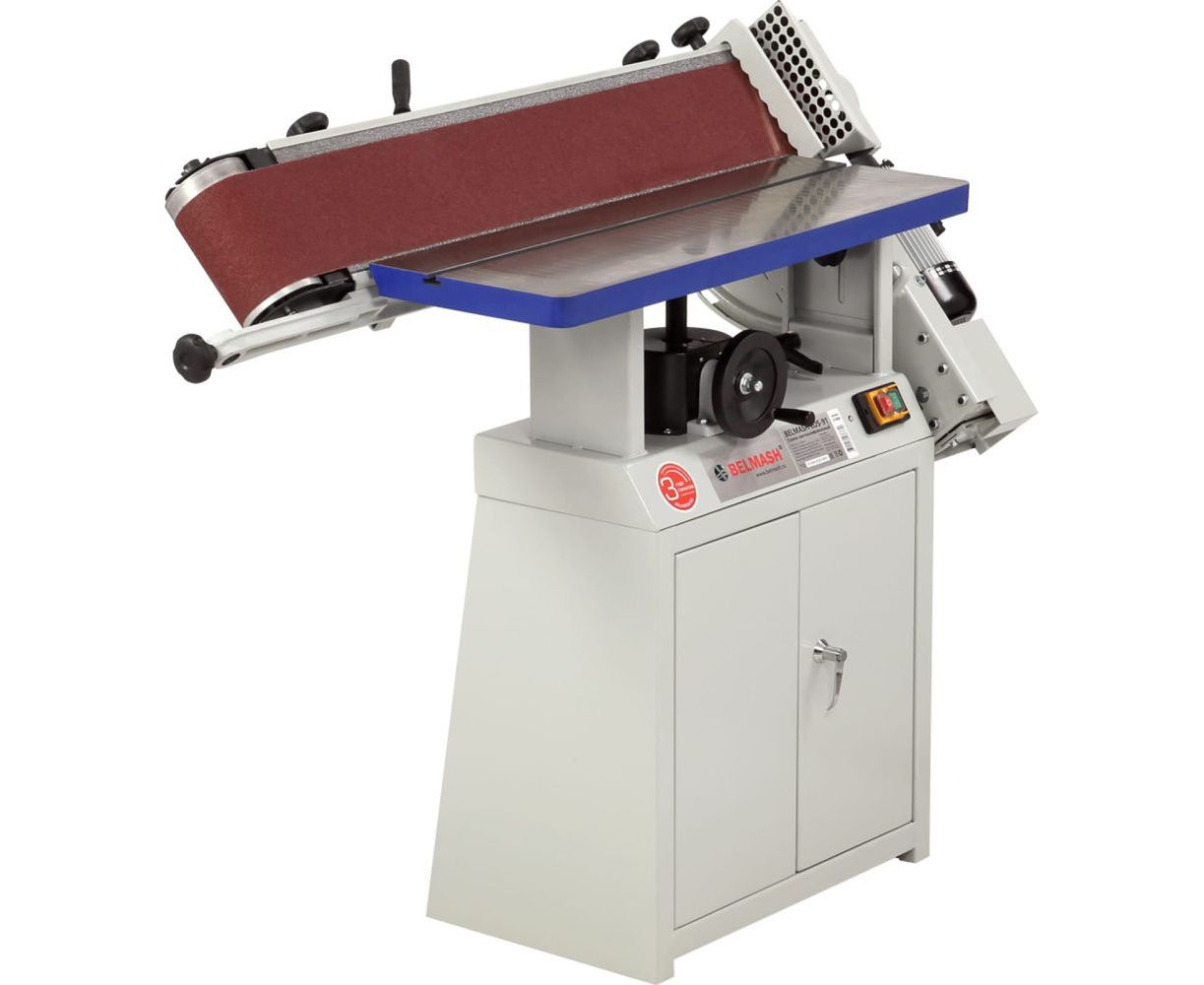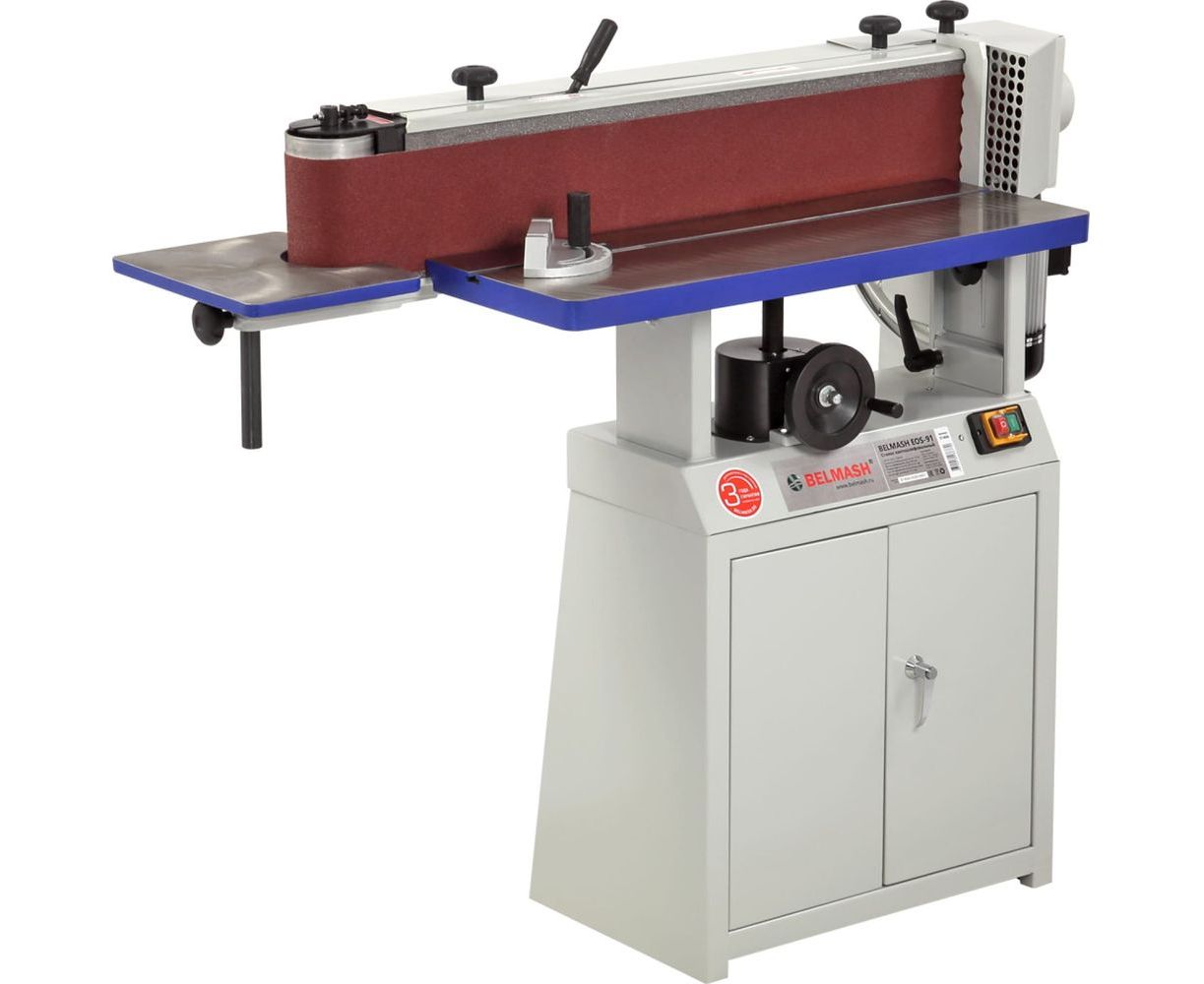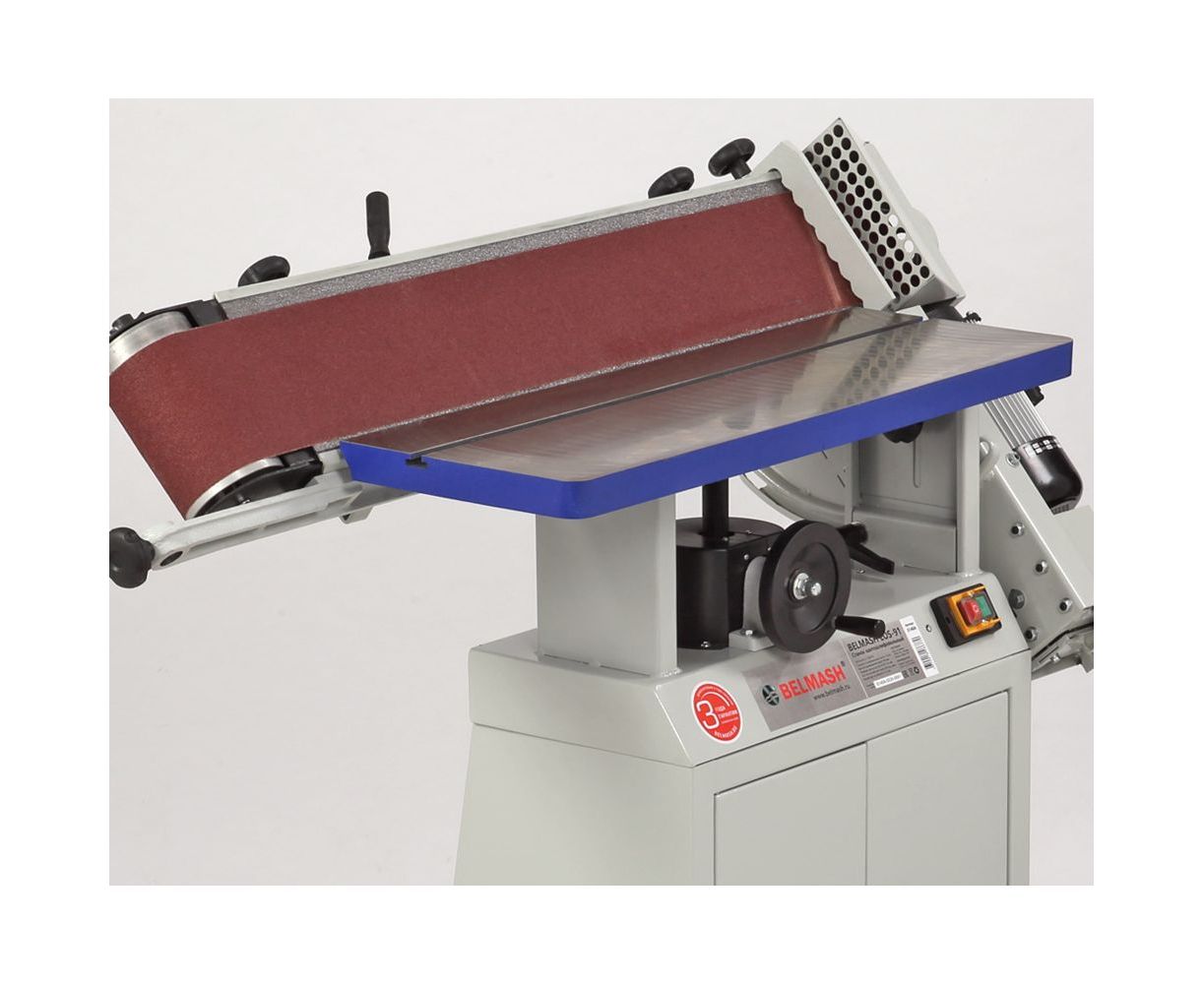 В движение ленту приводит однофазный асинхронный двигатель мощностью 2200 Вт. Ее скорость движения 16 м/с. Механизм осцилляции улучшает качество процесса шлифования. Амплитуда колебаний -12,5 мм. Поэтому при ширине ленты 152 мм максимальная высота обработки составляет 160 мм. Рабочие столы выполнены из чугуна и прошли фрезерное шлифование, имеют регулировку по высоте. В паз основного рабочего стола можно установить параллельную направляющую или угловой упор. Поэтому можно обрабатывать не только канты, но и пласть. Назначение малого стола - шлифование заготовок с внутренним радиусом закругления до 55 мм.