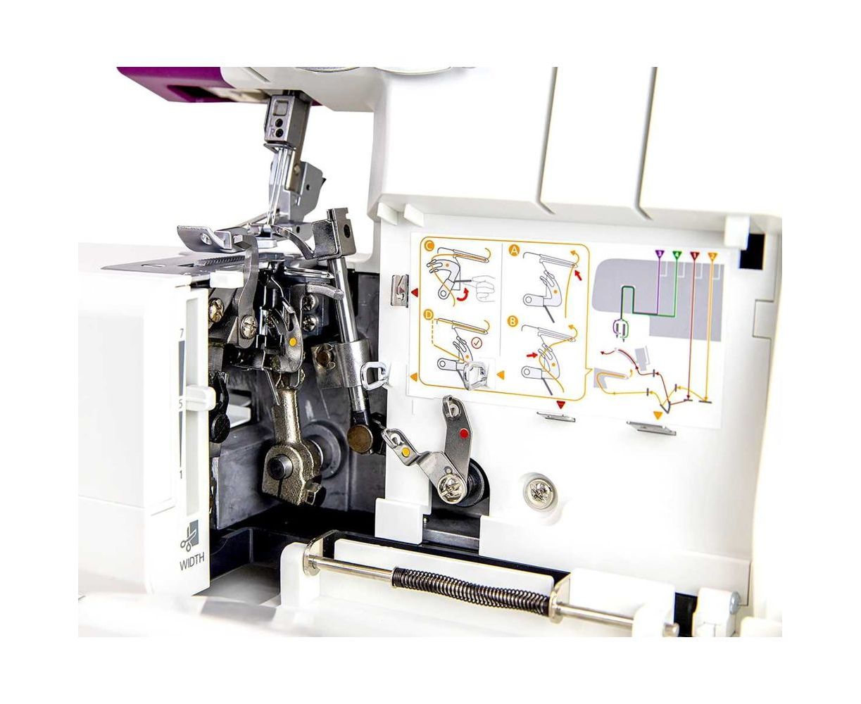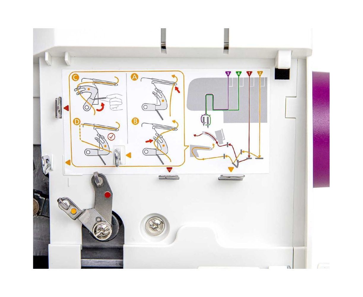 Заправка оверлока нитями упрощена цветными метками исключающий ошибки и неточности. Справочная информация содержится в цветной диаграмме на внутренней поверхности передней крышки.
