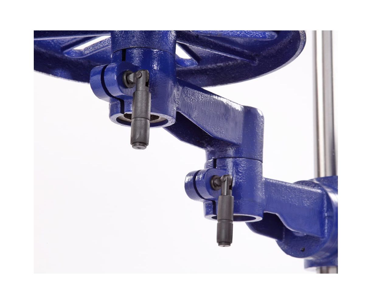 На стойке расположена зубчатая рейка, поднятие и опускание стола настраивается при помощи рукоятки. В опоре есть два монтажных отверстия для установки на верстак. Тиски (в комплекте) крепятся через специальные пазы на рабочем столе (6 шт.) и основании (2 шт.).