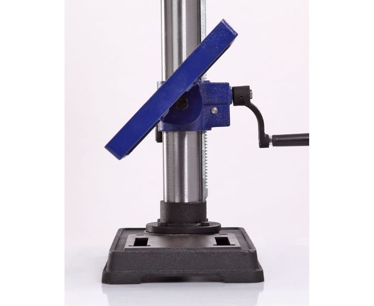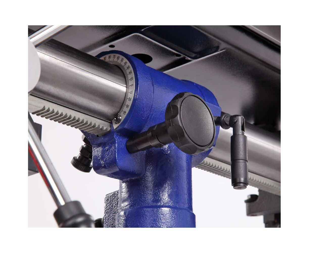 Станок имеет средний размер, исполнение настольное, высота в сборе – 810 мм. Максимальное расстояние между шпинделем и столом – 355 мм. Заготовку можно крепить как к рабочему столу, так и к основанию, все зависит от ее размера. В комплекте предусмотрены тиски. Для их крепления есть по два паза на рабочем столе и на основании.