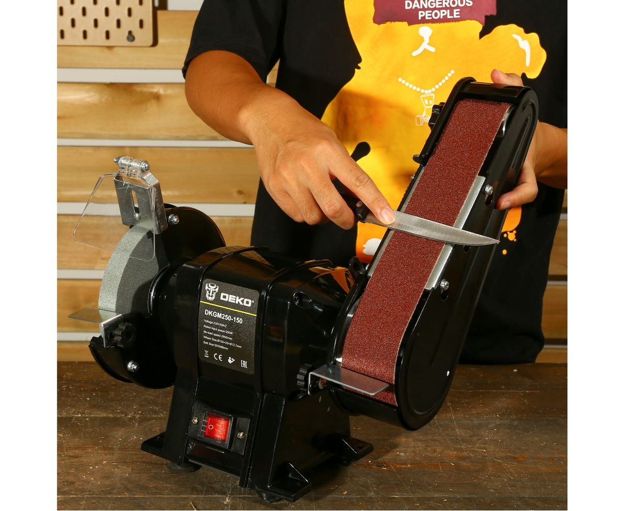 Заточной станок DKGM250-150 DEKO 063-4214 используется для заточки и шлифования инструмента. Модель отличается небольшими габаритами, что существенно облегчает его транспортировку. Шлифовальные диски закрыты защитными кожухами, которые обеспечивают безопасность оператора. Имеет возможность шлифования больших площадей благодаря абразивной ленте.