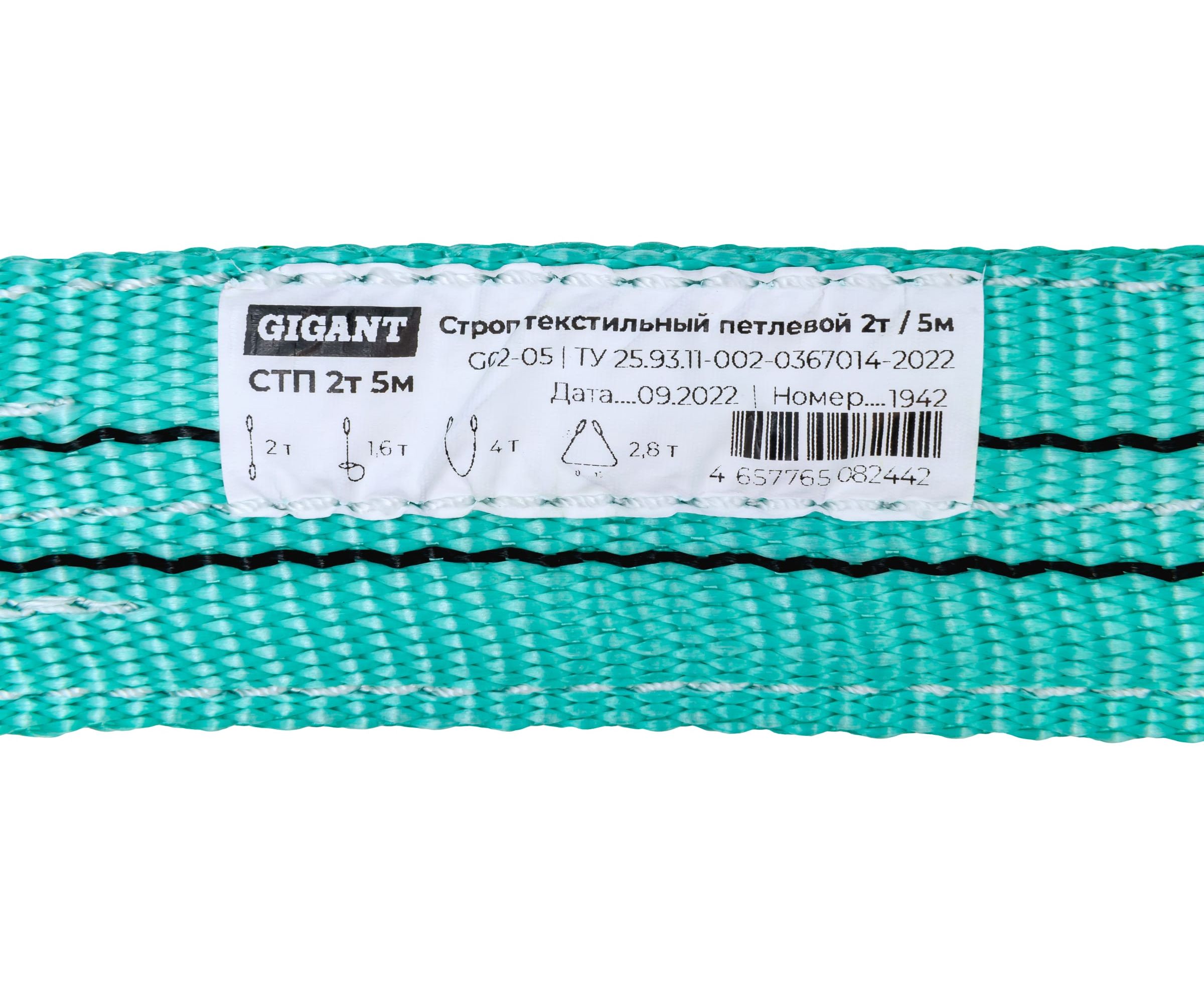 Gigant Строп текстильный петлевой СТП 2Т/5М G02-05 обеспечивает простоту транспортировки крупногабаритного груза. Служит для фиксации и перемещения грузов на строительной площадке, в цеху, складских помещениях и для прочих грузоподъемных работ. При необходимости строп можно свернуть в кольцо или использовать петлей. Длина стропа - 5 м, грузоподъемность - 2 т.