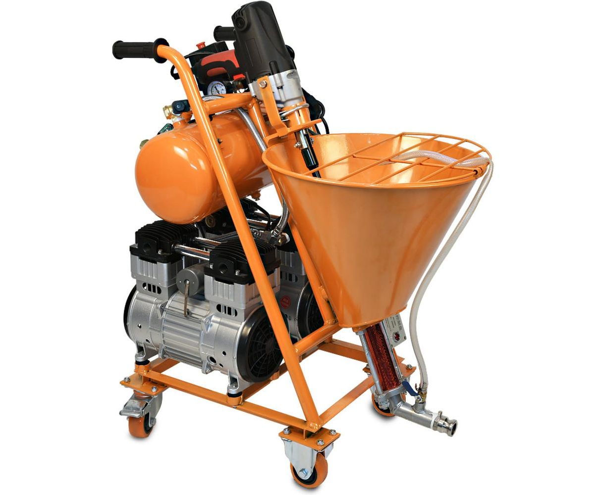 Готовая смесь в перемешанном виде помещается в бункер и с помощью героторной пары подается по шлангу на пистолет (по принципу "мясорубки"). Распыление материала осуществляется за счет воздуха, подаваемого двумя компрессорами.