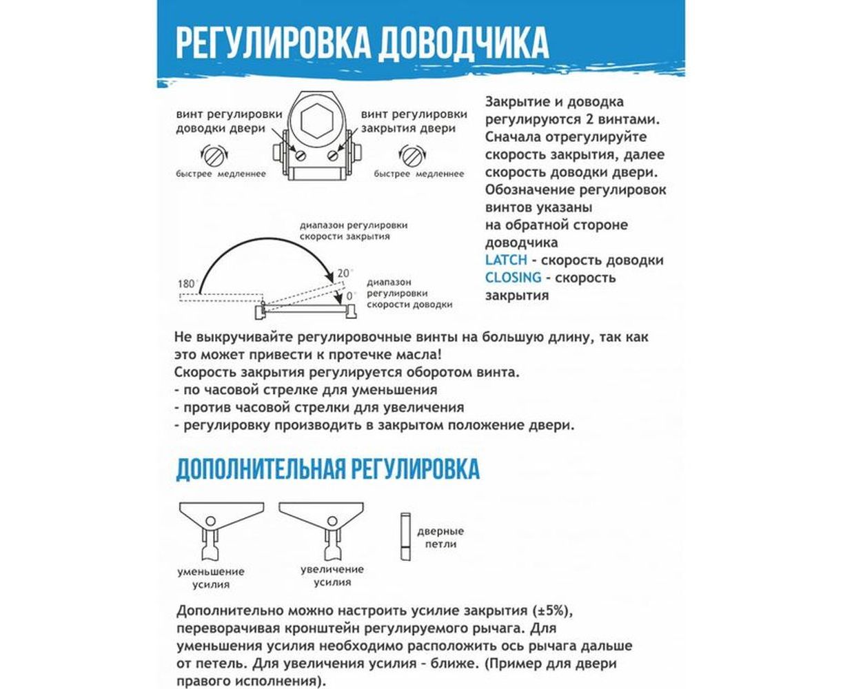 Скорость закрывания и скорость доводки двери регулируются независимо, при установке.