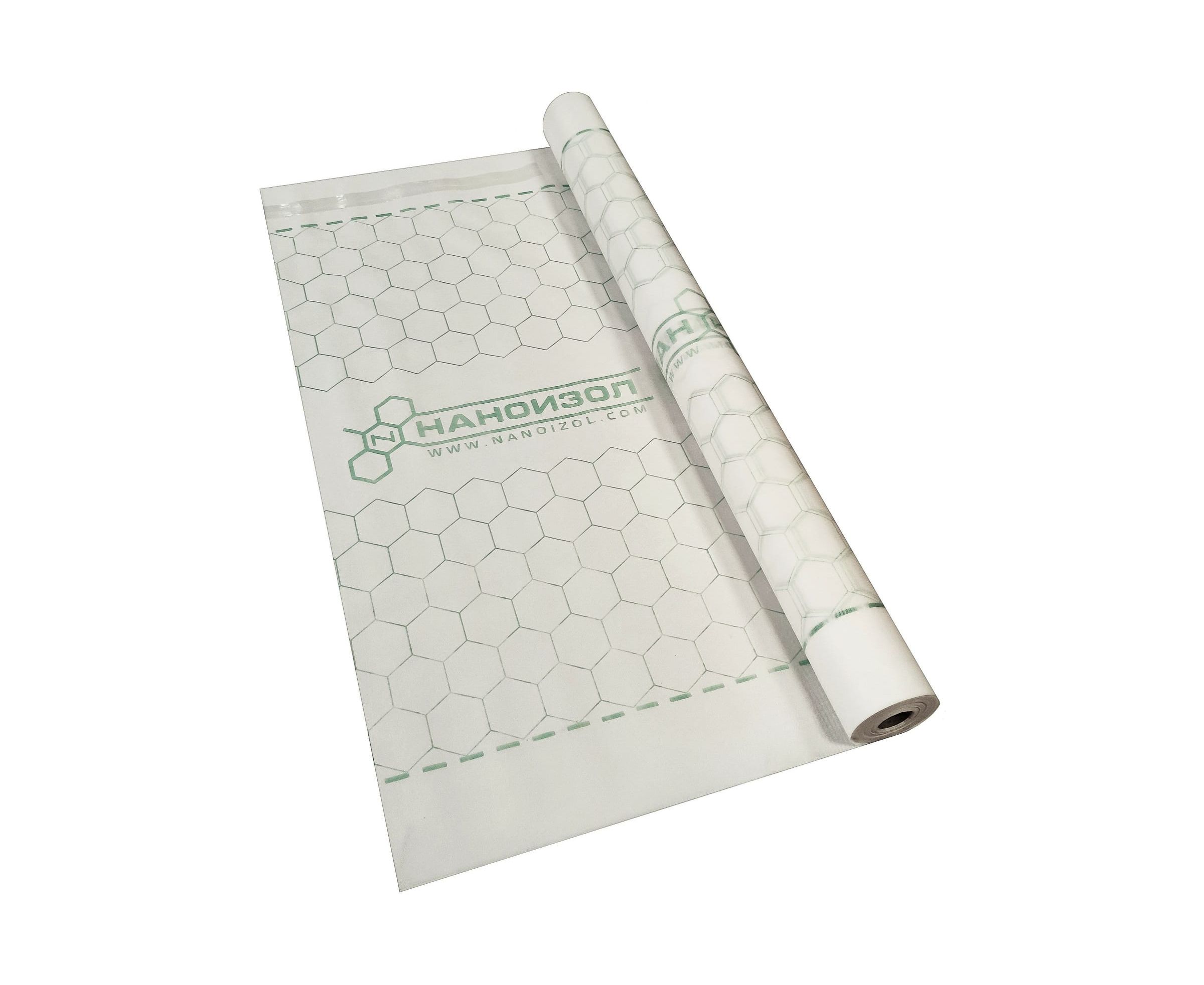 Ветровлагозащитная паропроницаемая мембрана Наноизол A с клеевой лентой, 70 кв. м 4610003800963 - однослойная паропроницаемая мембрана высокой прочности, предназначена для защиты строительных конструкций и утеплителя в них от ветра и конденсата. Имеет волокнистую структуру, что обеспечивает выведение водяного пара из конструкции и утеплителя, защищает их от попадания влаги из внешней среды и защищает от выветривания частиц утеплителя.