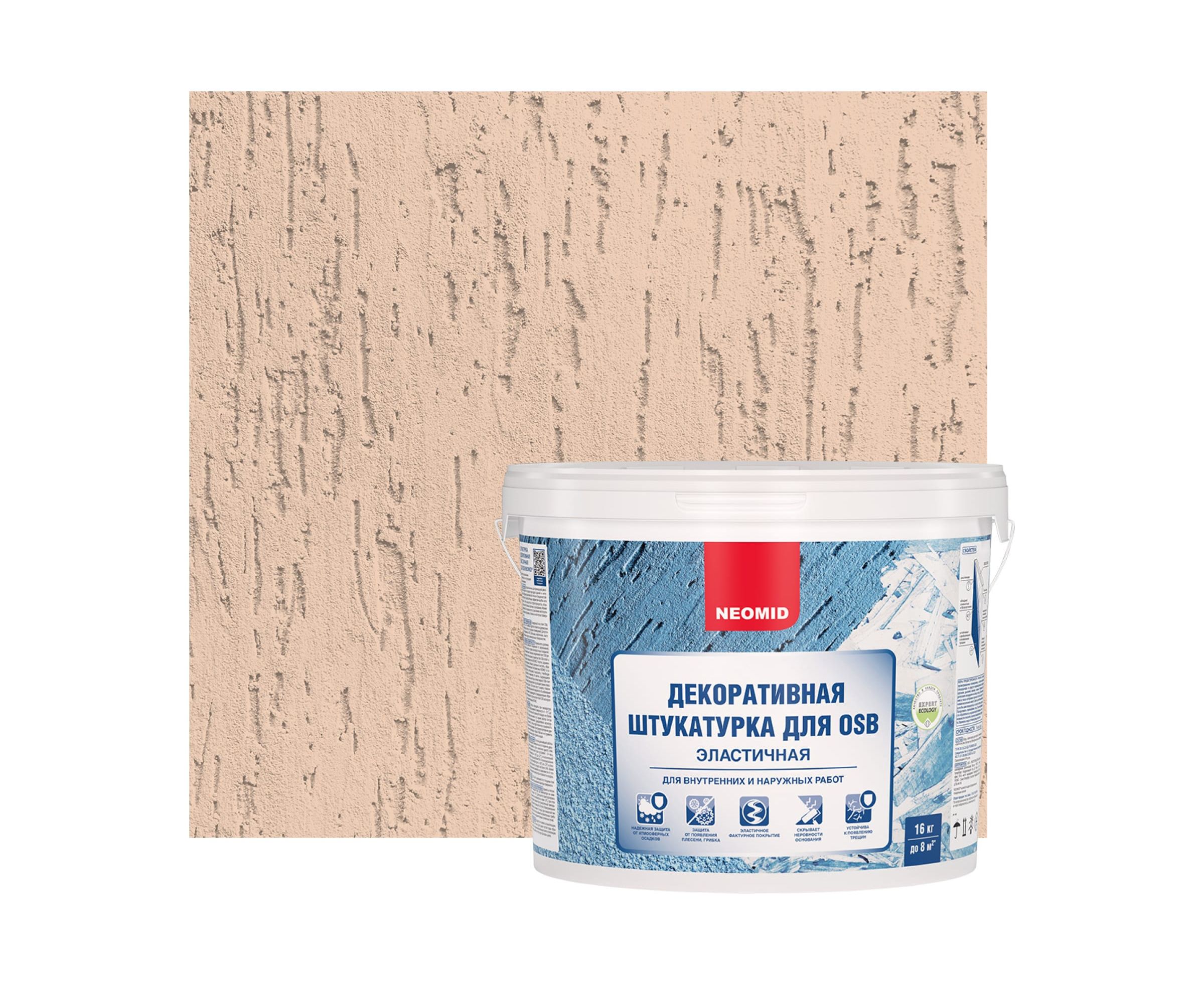 Штукатурка декоративная эластичная для плит OSB "Короед" (16 кг; Бежевый) Neomid Н-Короед-16/беж используется для финальной декоративно-защитной отделки фасадов зданий и интерьеров. Предназначена для поверхностей из плит OSB, SIP, ДВП, ДСП, ЦСП, фанеры и прочих пористых материалов из древесины. Применяется как внутри, так и снаружи помещений. Возможно использование на ГКЛ, бетонных, кирпичных, оштукатуренных и других минеральных поверхностях.