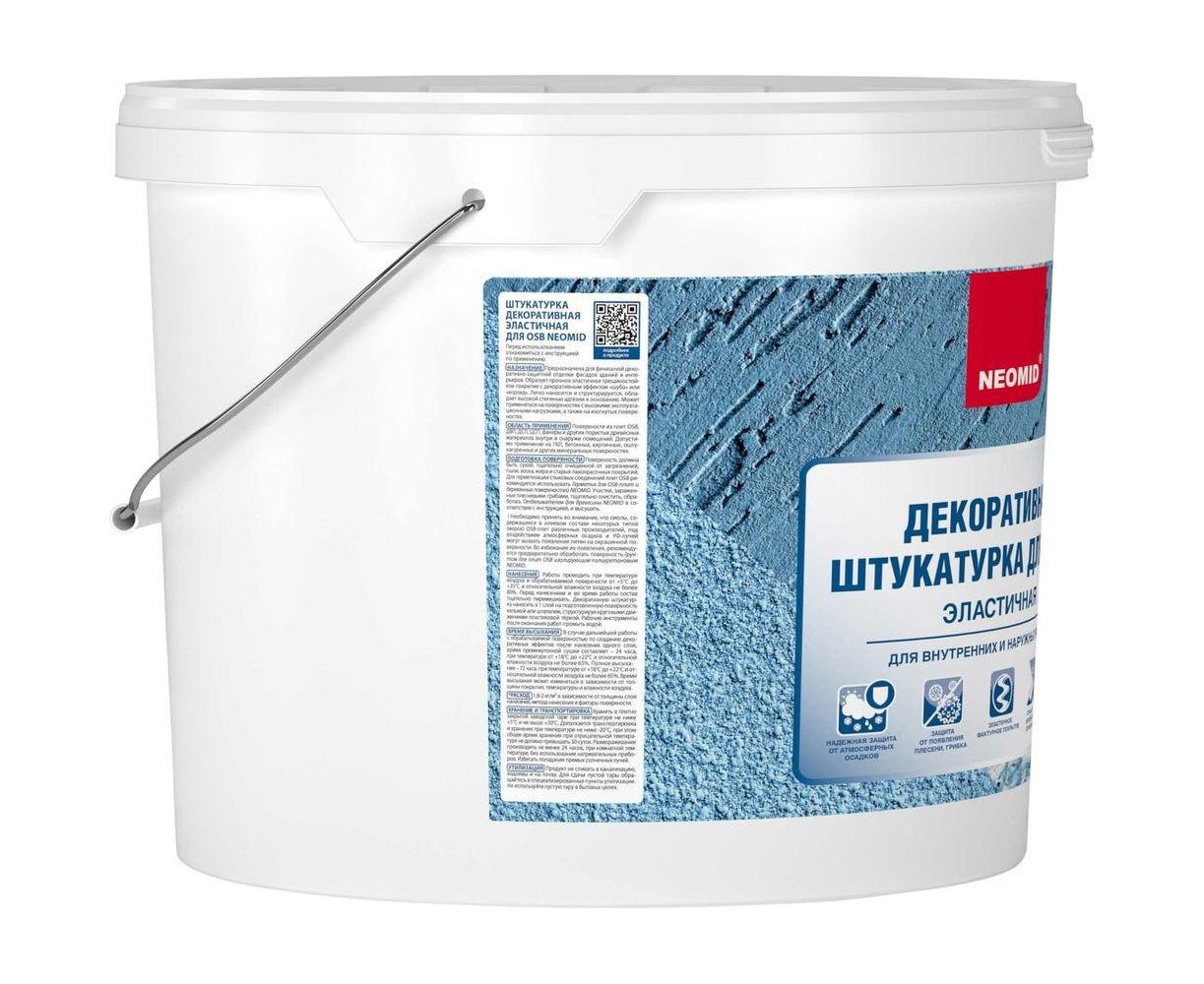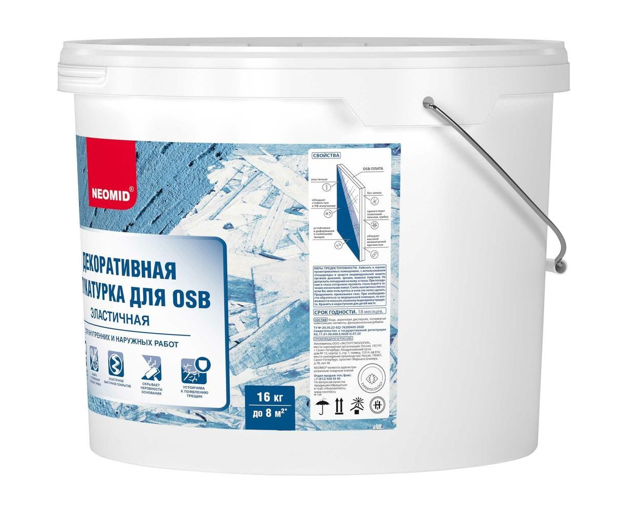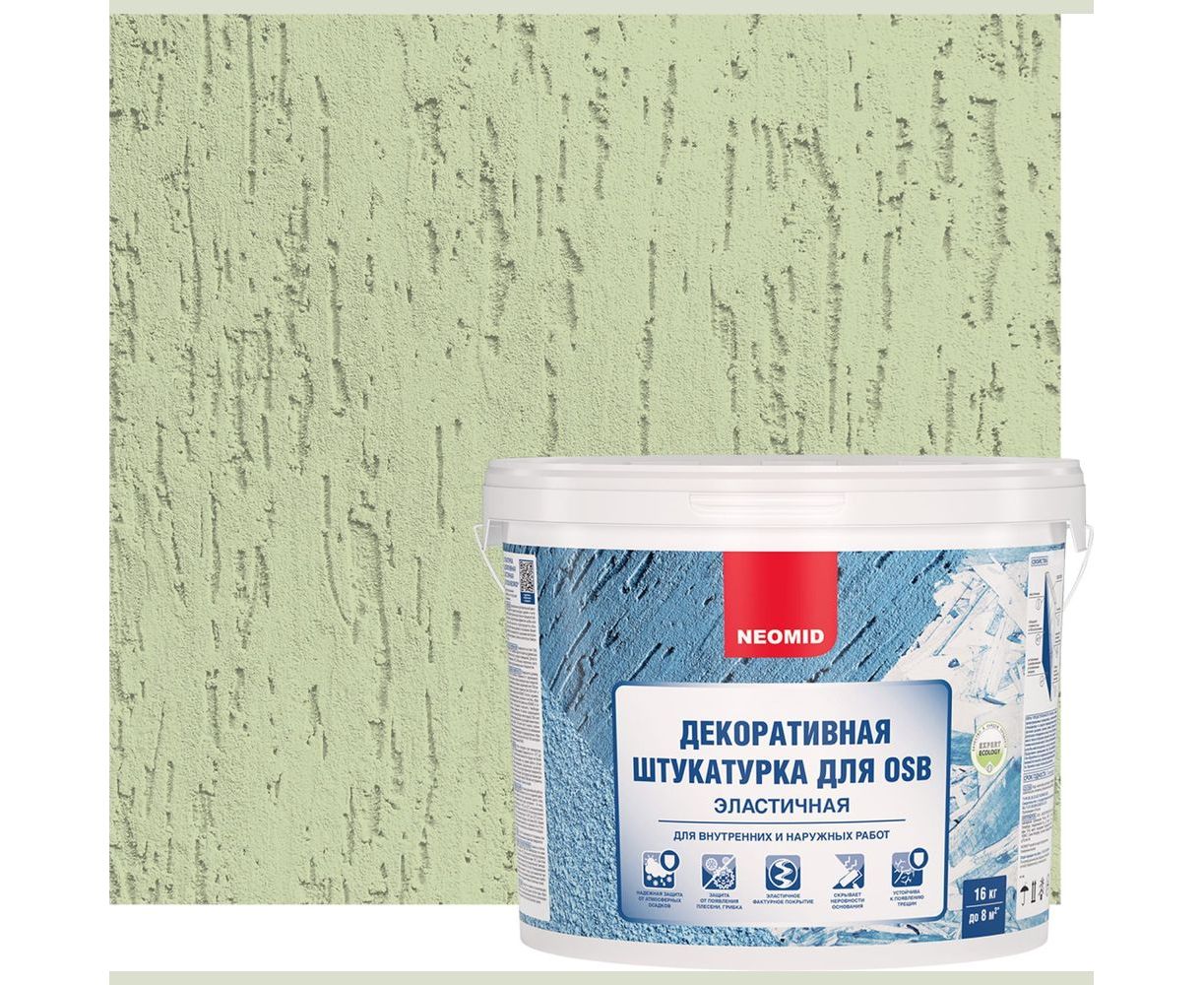 Штукатурка декоративная эластичная для плит OSB "Короед" (16 кг; Светло-зелёный) Neomid Н-Короед-16/све используется для завершающей декоративно-защитной отделки фасадов и интерьеров. Подходит для поверхностей из плит OSB, SIP, ДВП, ДСП, ЦСП, фанеры и прочих пористых материалов из древесины. Применяется как внутри, так и снаружи помещений. Допустимо использование на ГКЛ, бетонных, кирпичных, оштукатуренных и других минеральных поверхностях.