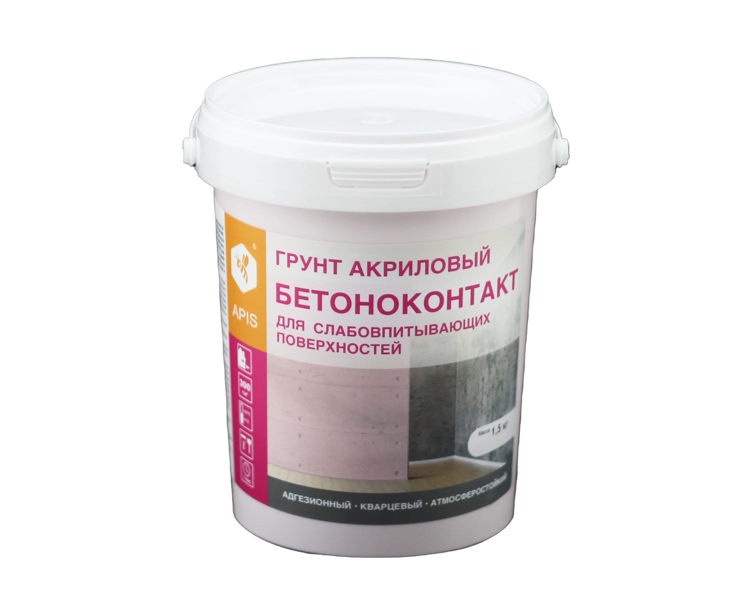 Акриловый грунт APIS БЕТОНОКОНТАКТ кварцевый, для внутр. и наруж. работ, ведро 1,5 кг 4665296513816 улучшает адгезию слабовпитывающих поверхностей. Состав образует шероховатое покрытие, которое хорошо сцепляется с последующем слоем отделочных материалов. Продукт позволяет качественно штукатурить гладкие основания без использования дополнительных приспособлений.