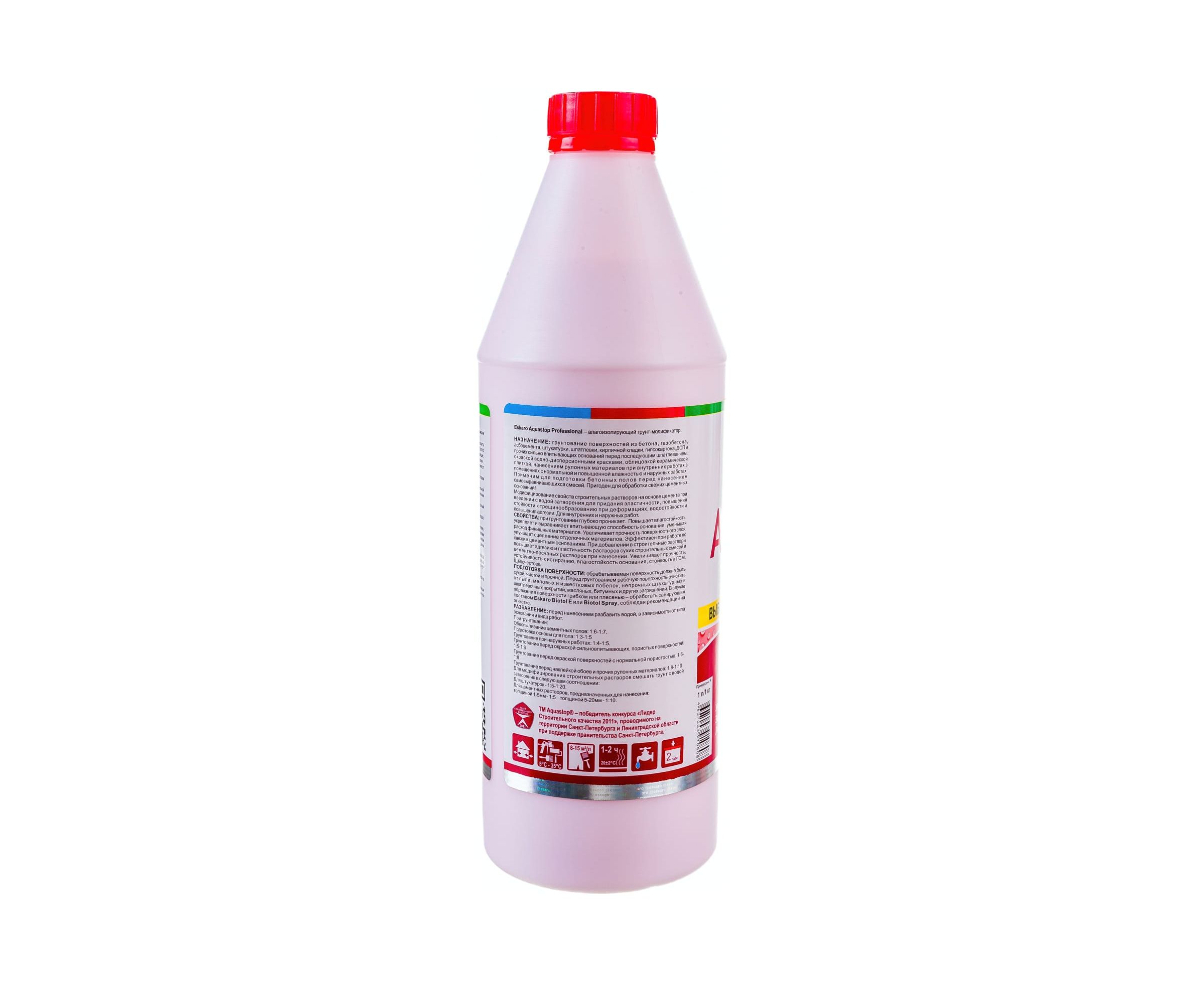 Грунт Eskaro Aquastop Professional 1 л G0002 применяется для грунтования таких поверхностей, как бетон, газобетон, асбоцемент, штукатурка, шпатлевка, кирпичная кладка, гипсокартон, ДСП перед последующим шпатлеванием, окраской, облицовкой. Используется при внутренних работах в помещениях с нормальной и повышенной влажностью, а также наружных работах. Возможна обработка бетонных полов перед нанесением самовыравнивающихся смесей.