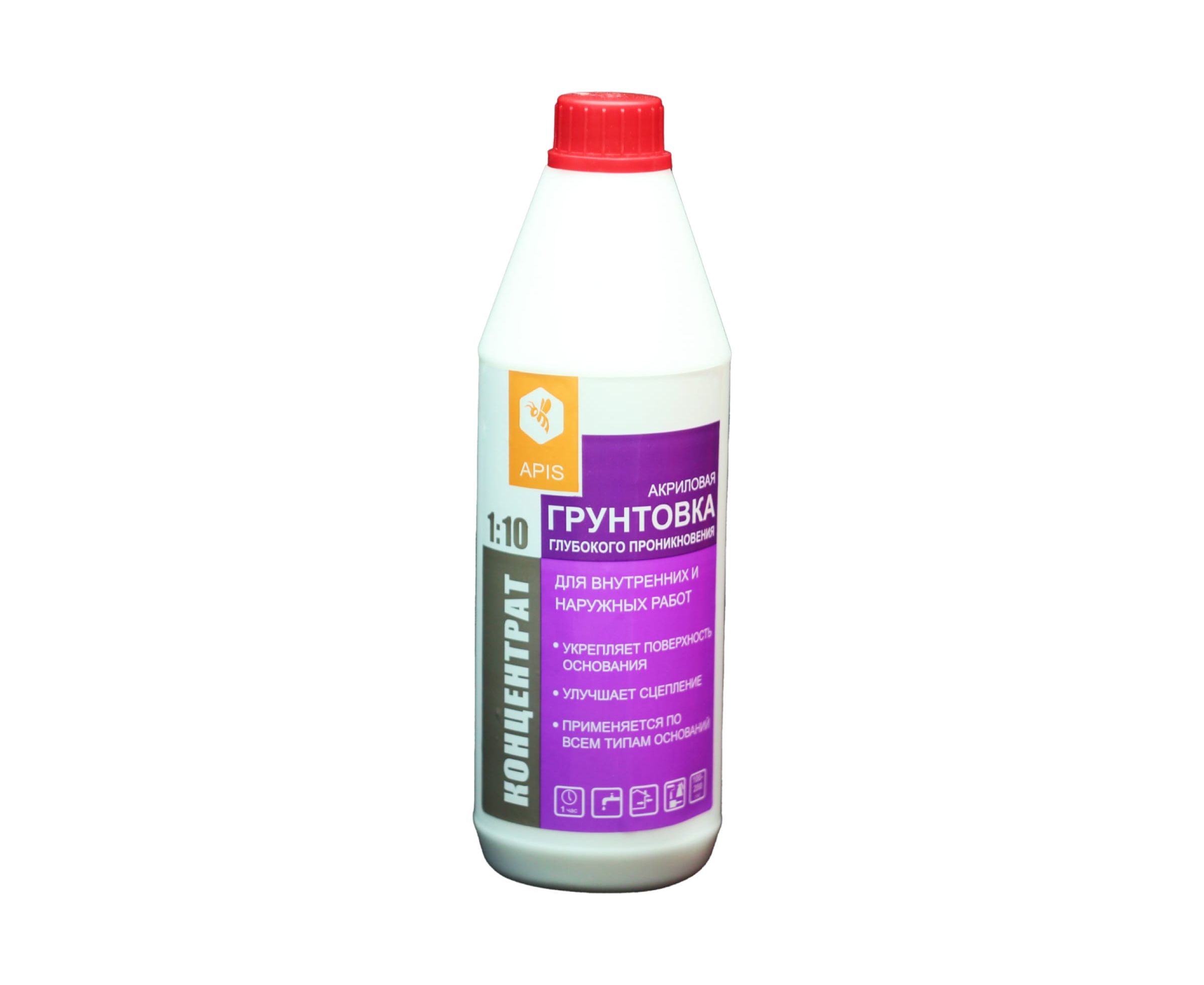 Грунтовка глубокого проникновения APIS концентрат 1:10, бутылка 1 кг 4665296510136 предназначена для предварительной обработки различных поверхностей внутри и снаружи помещений. Состав улучшает адгезию финишных отделочных материалов, уменьшает впитываемость, обеспыливает и укрепляет рыхлые основания. Использование концентрата выгодно при больших объемах работ.