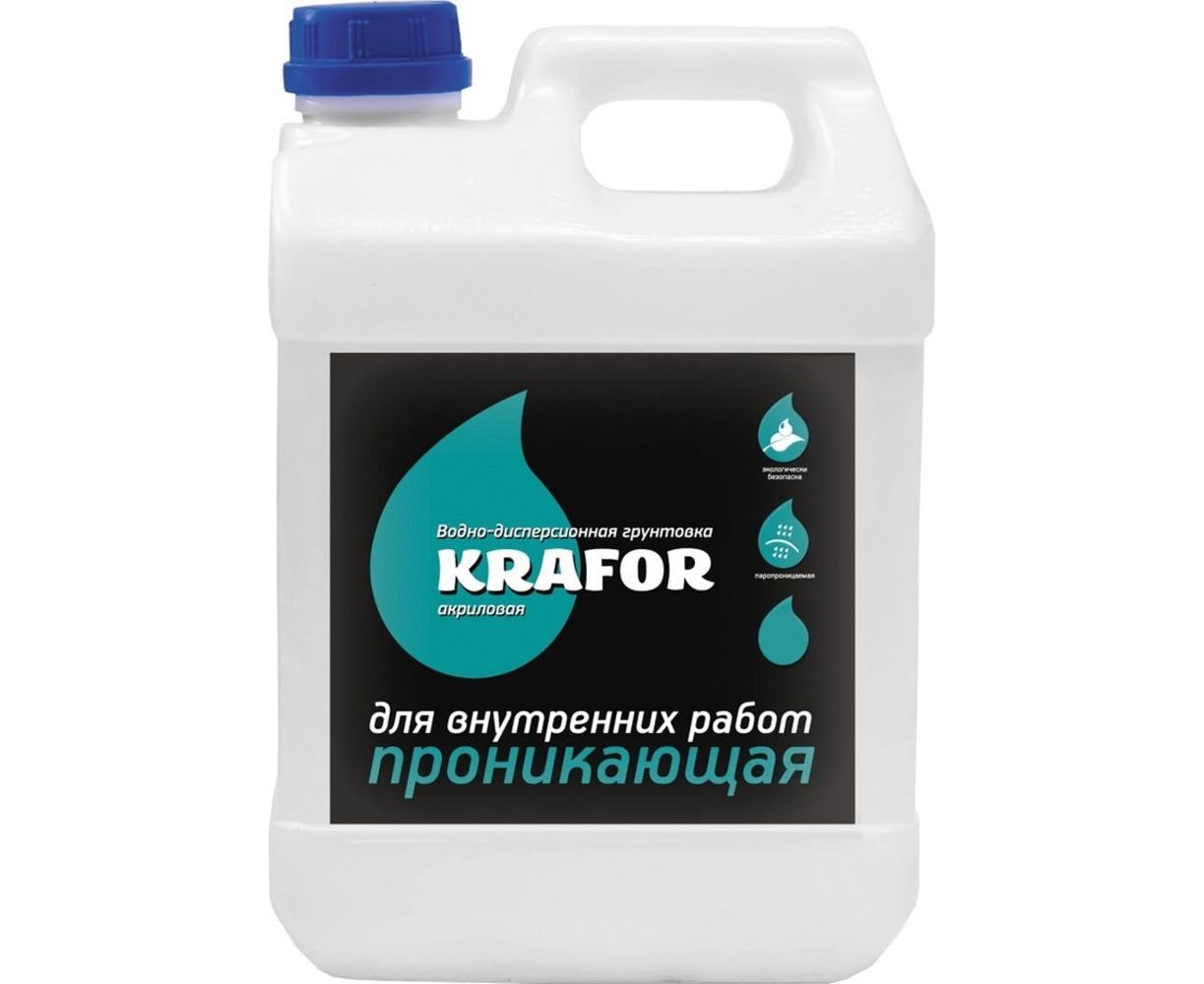 Проникающая грунтовка для внутренних работ KRAFOR 5 л (1) зеленая этикетка 27 332 подготавливает поверхности внутри помещений к последующему нанесению отделочных материалов и самовыравнивающихся смесей. Продукт используют для грунтования полов и стен.