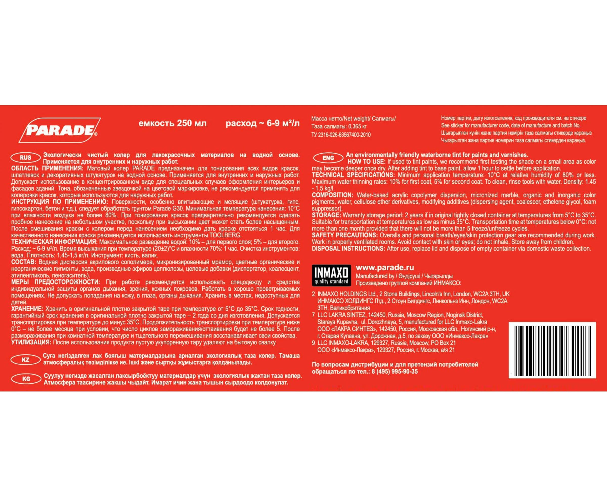Колер PARADE №201 Охра 0,25 л Россия 90001651667 - экологически чистый колер. Предназначен для тонирования всех видов красок, шпатлевок и декоративных штукатурок на водной основе. Для внутренних и наружных работ.
