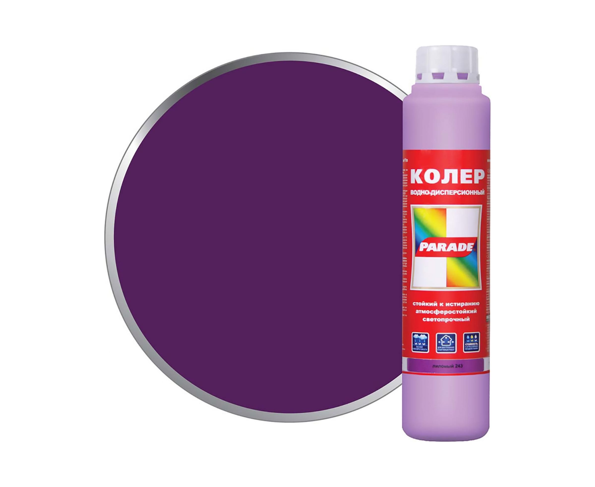Колер PARADE №243 Лиловый 0,75 л Россия 90001421817 - экологически чистый колер. Предназначен для тонирования всех видов красок, шпатлевок и декоративных штукатурок на водной основе. Для внутренних и наружных работ.