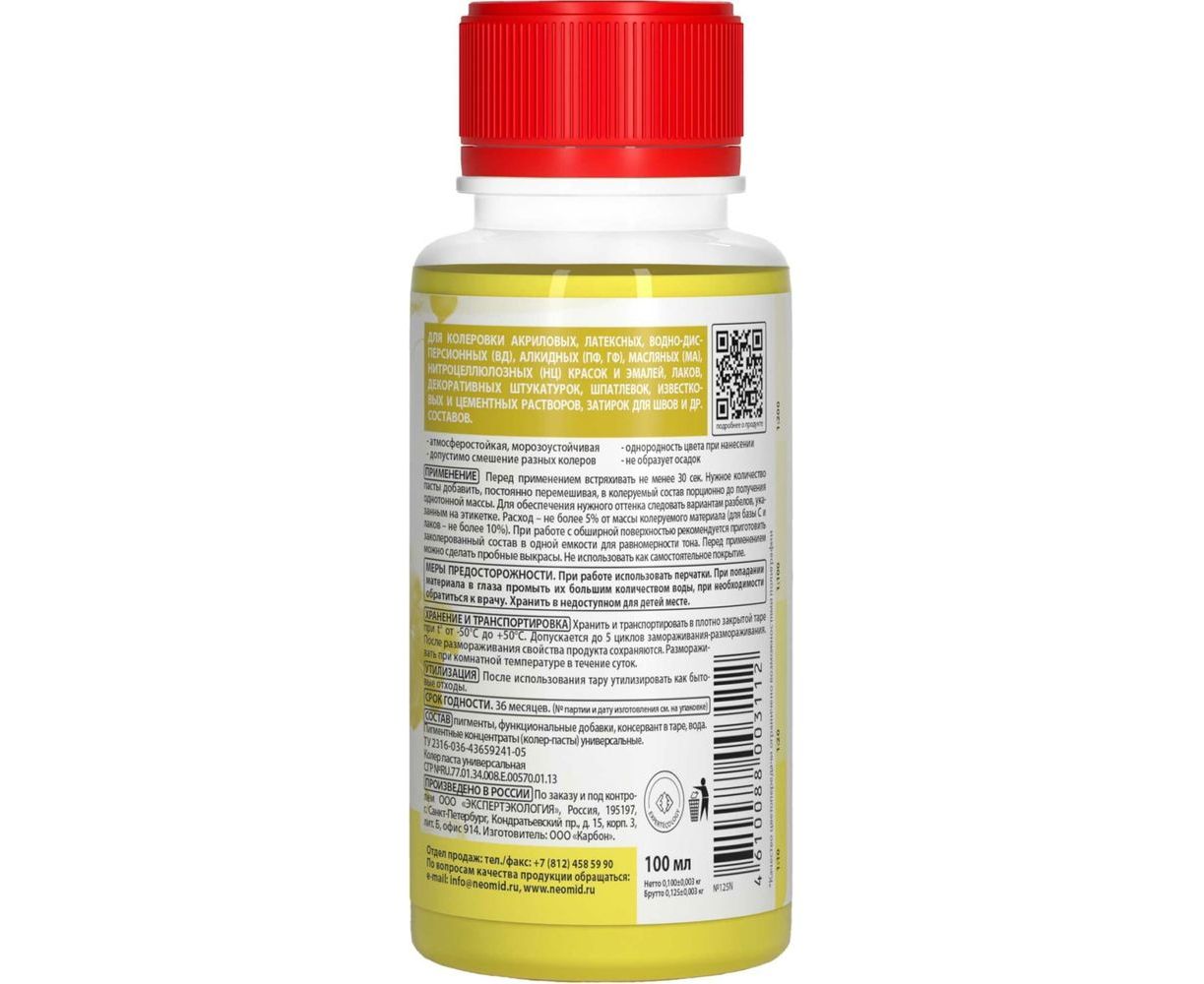 Колер-паста универсальная NEOMID Палитра №1 (01 лимонный) 100 мл Н-КолПаста-01-лим предназначена для колеровки акриловых, латексных, водно-дисперсионных (ВД), алкидных (ПФ, ГФ), масляных (МА), нитроцеллюлозных (НЦ) красок и эмалей, лаков, декоративных штукатурок, шпатлевок, известковых и цементных растворов, затирок для швов и др. составов.