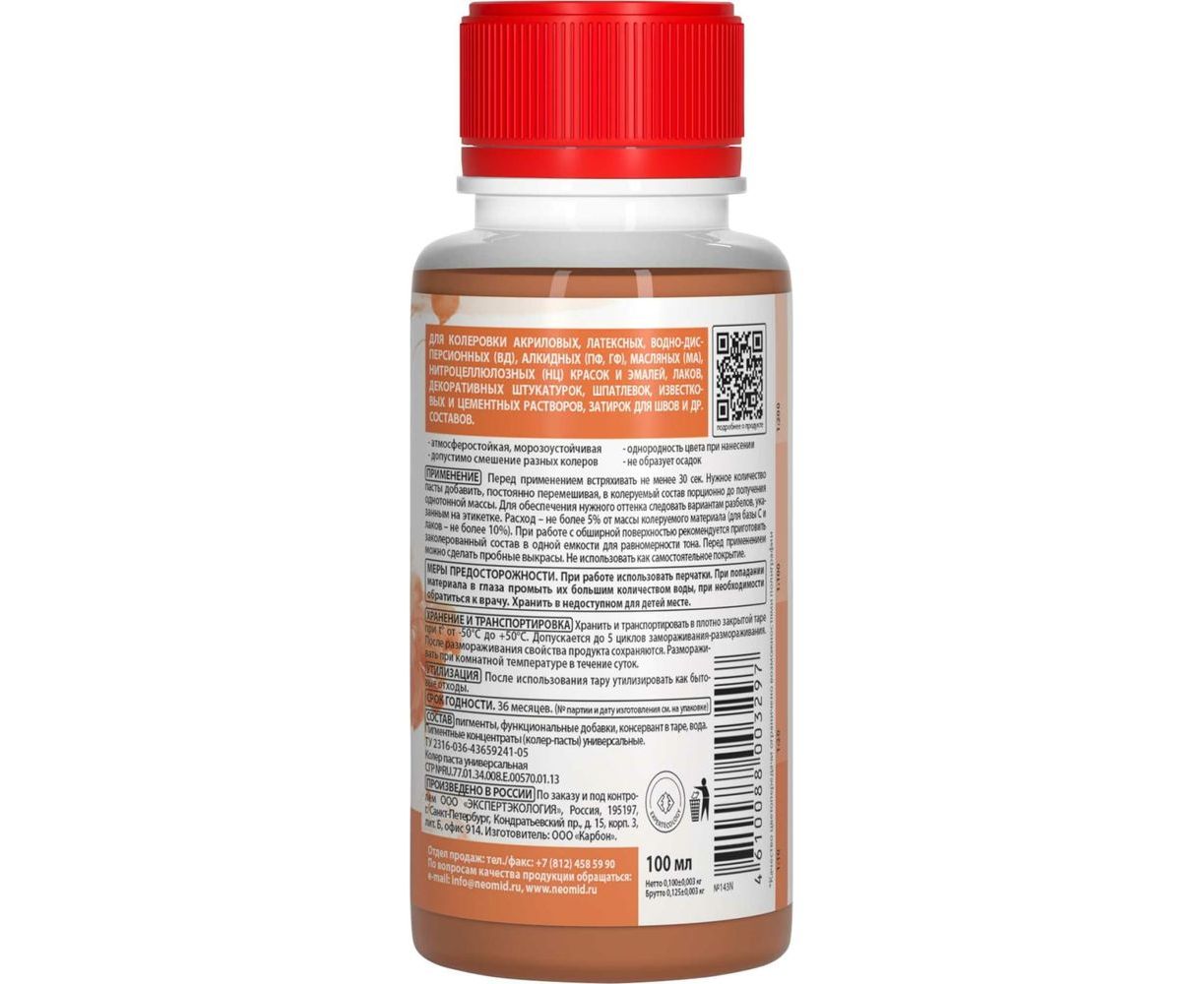 Колер-паста универсальная NEOMID Палитра №1 (23 карамель) 100 мл Н-КолПаста-23-кар предназначена для колеровки акриловых, латексных, водно-дисперсионных (ВД), алкидных (ПФ, ГФ), масляных (МА), нитроцеллюлозных (НЦ) красок и эмалей, лаков, декоративных штукатурок, шпатлевок, известковых и цементных растворов, затирок для швов и др. составов.