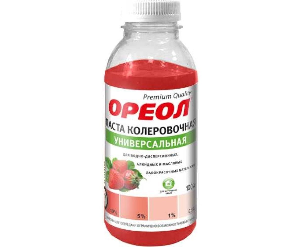 Универсальная колеровочная паста ОРЕОЛ алый (07), 100 мл 4764 предназначена для ручного колерования красок, эмалей, лаков, сухих строительных смесей, растворов, побелочных и других составов на водной и органической основе.