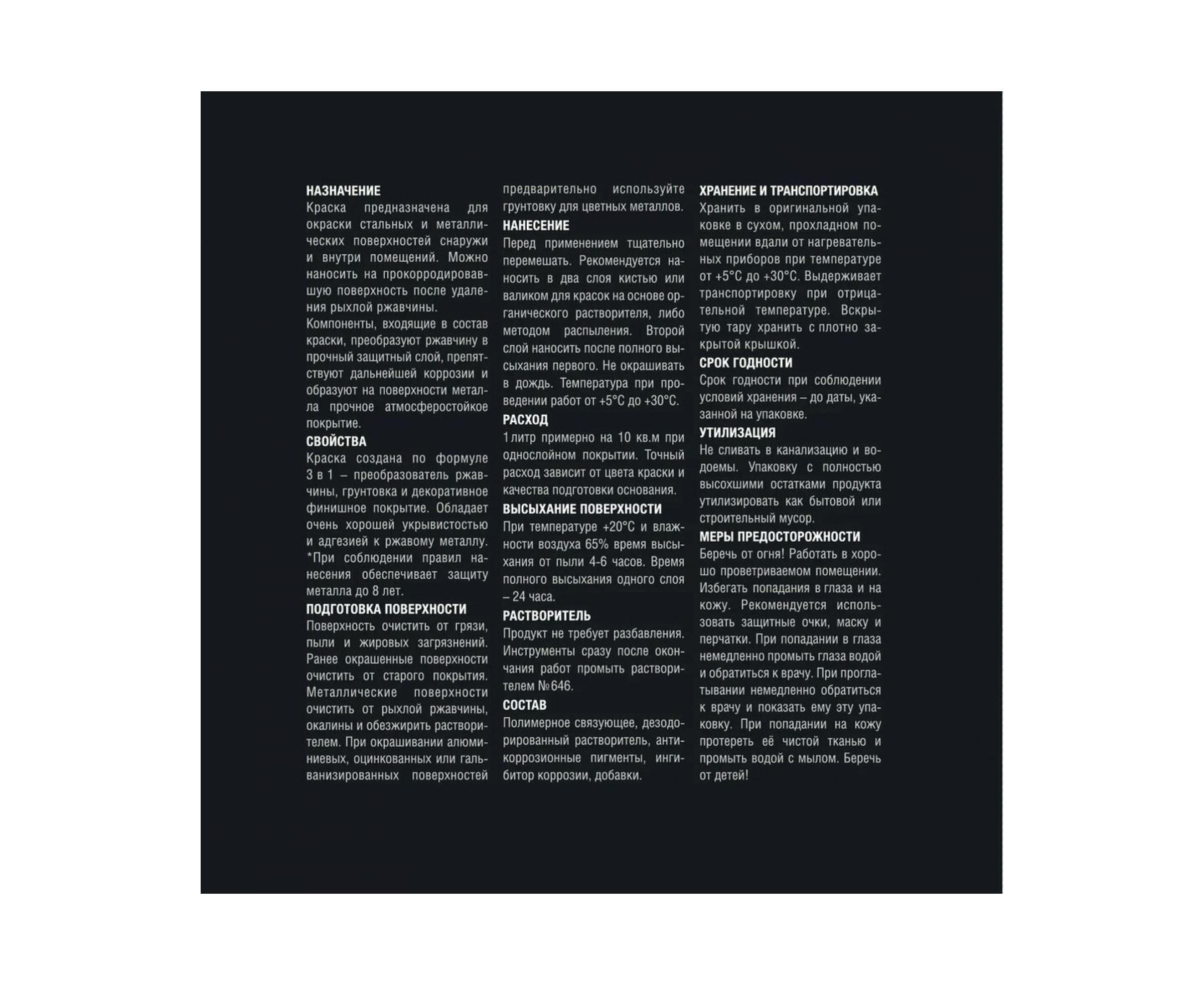 Краска по металлу HUSKY KLONDIKE (глянцевая; черная RAL 9005; 0.9 л) 25616 предназначена для стальных и металлических поверхностей снаружи и внутри помещений. Образует гладкую поверхность с эффектом металлик. Краска создана по формуле 3 в 1 – это преобразователь ржавчины, грунтовка и декоративное финишное покрытие. Может наноситься прямо на ржавчину. Обеспечивает защиту металла и сохраняет декоративные свойства до 8 лет.