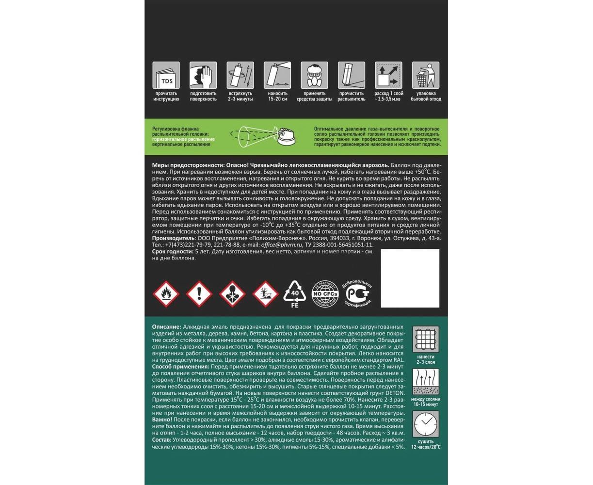 Эмаль DETON алкидная, атмосферостойкая, черный, глянцевый, RAL 9017, аэрозоль 650 мл DTN-A07577 предназначена для покраски предварительно загрунтованных металлических и деревянных поверхностей, а также изделий из пластика, картона, бетона, камня.