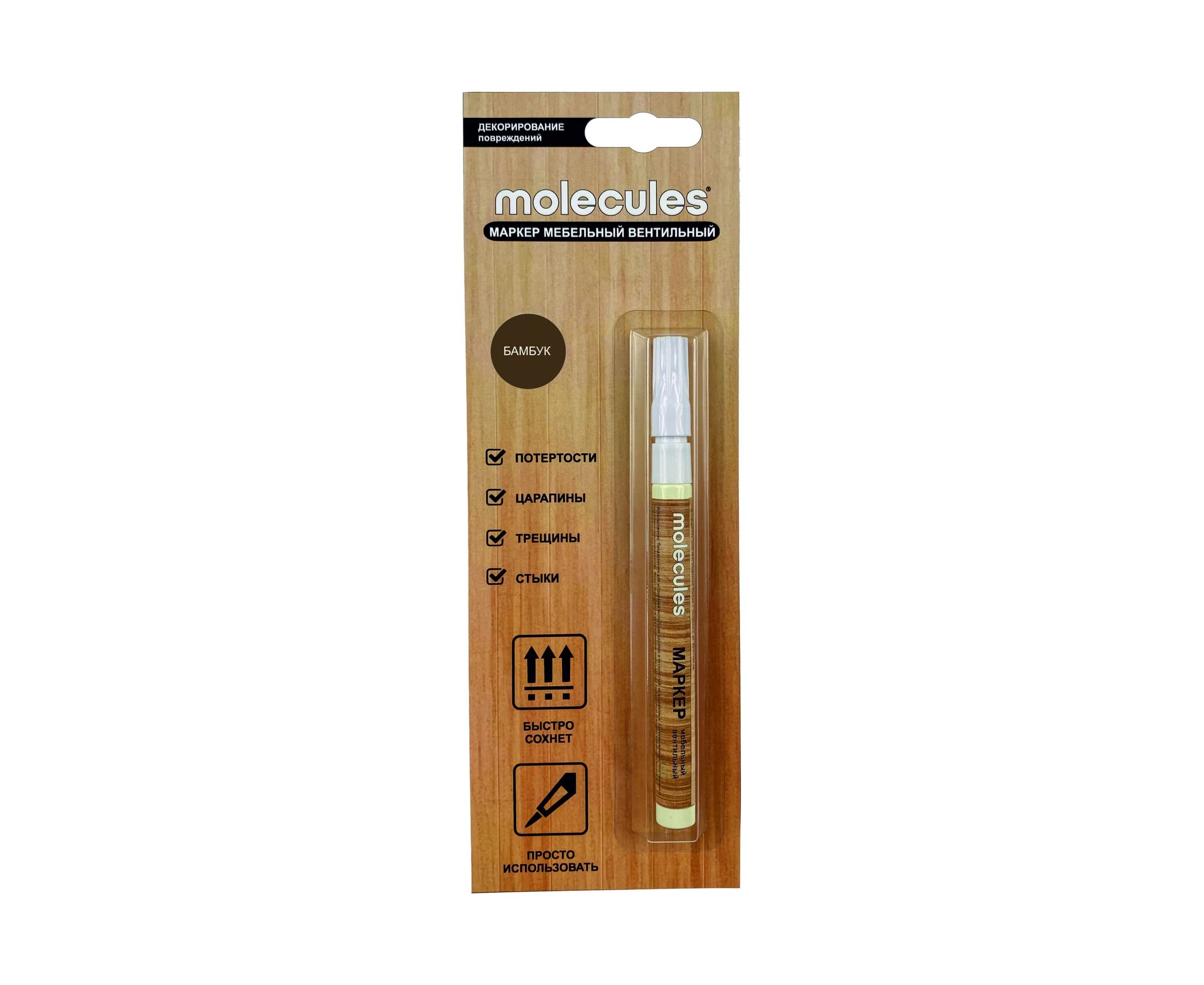 Мебельный вентильный маркер Molecules Бамбук KMLS703 предназначен для быстрого и удобного устранения неглубоких царапин и потертостей на деревянных, ламинированных, пластиковых и металлических поверхностях. Может применяться для затемнения краев царапин перед использованием мебельных восков и карандашей, а так же для восстановления текстуры поверхности после реставрации повреждения.