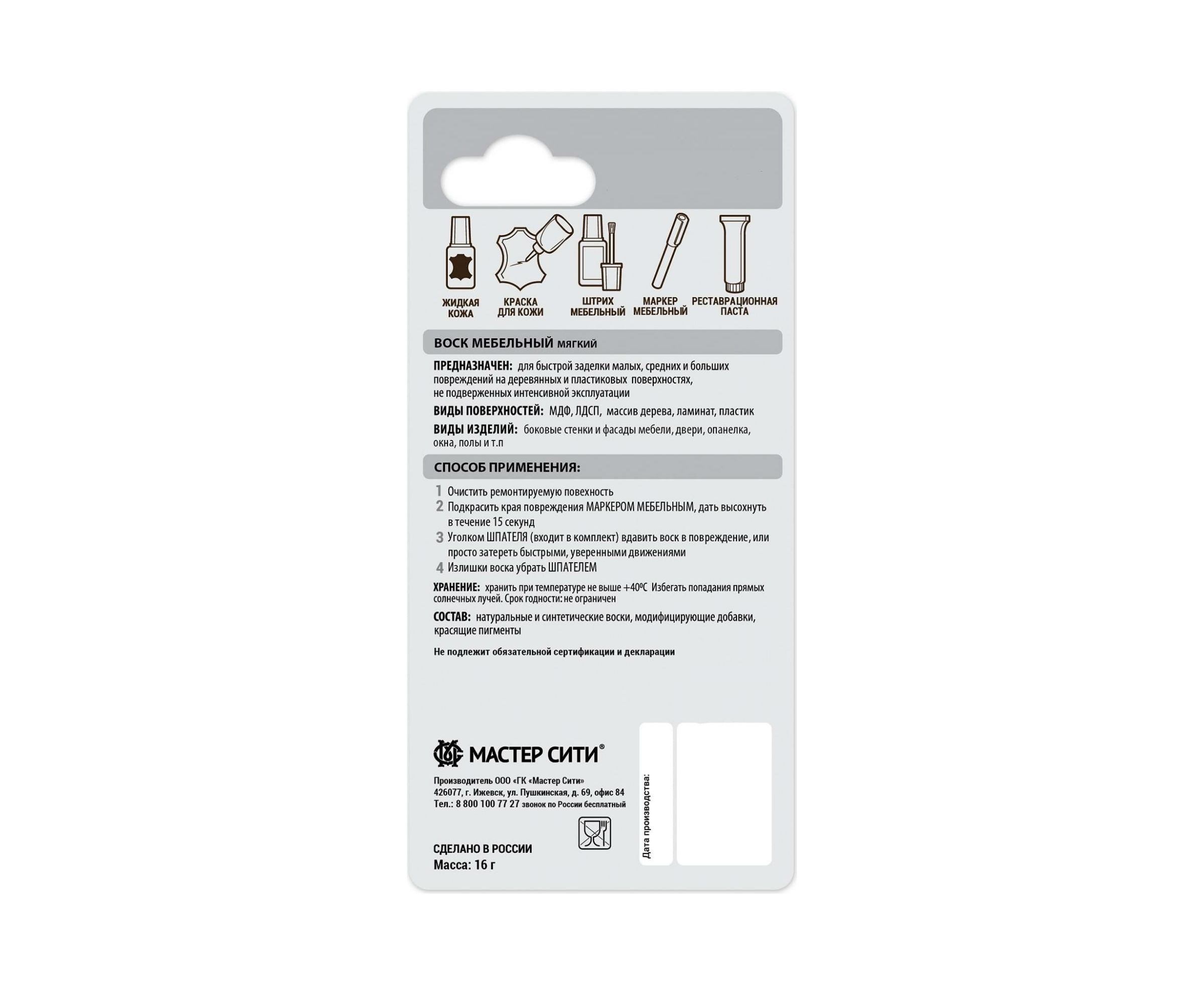 Мебельный мягкий воск Мастер Сити (блистер; орех миланский 414) 2011414 предназначен для быстрой реставрации повреждений (сколы, вмятины, трещины, царапины) на деревянных поверхностях, не подверженных интенсивной эксплуатации.