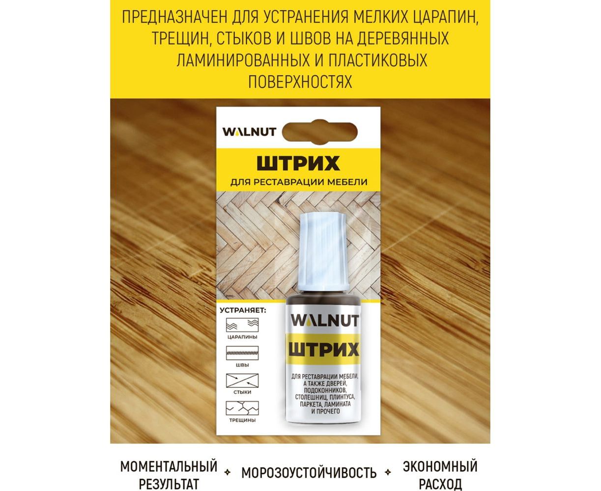 Мебельный штрих - это специальный маскирующий материал, который используется для восстановления и реставрации деревянных, ламинированных и пластиковых поверхностей в вашем доме. Он подходит для устранения мелких дефектов, таких как царапины, трещины, стыки и швы. Краска поможет обновить внешний вид паркета, ламината, кухонных столешниц, декоративных статуэток, дверей и других поверхностей из дерева или пластика. Процесс использования мебельного штриха включает в себя несколько этапов: прежде всего, необходимо тщательно взболтать содержимое флакона, чтобы равномерно распределить пигмент и обеспечить однородность цвета, далее очистить реставрируемую поверхность от пыли и грязи, высушить ее и обезжирить. Затем с помощью кисточки равномерно нанести на поврежденный участок тонким слоем. Не забудьте удалить излишки влажной салфеткой или тканью, оставьте изделие до полного высыхания. Жидкая консистенция продукта обеспечивает надежное сцепление состава с поверхностью, поэтому, при необходимости, можно нанести больше слоев, давая каждому из них высохнуть в течение 5-7 минут. После использования корректирующего средства рекомендуем покрыть участок фиксирующим лаком, для обеспечения большей устойчивости отреставрированного участка к дальнейшим механическим повреждениям. Перед использованием штриха важно убедиться в его соответствии цвету мебели, так как это влияет на результат реставрации, также состав продукта отлично колеруется, что позволяет получить нужный оттенок.