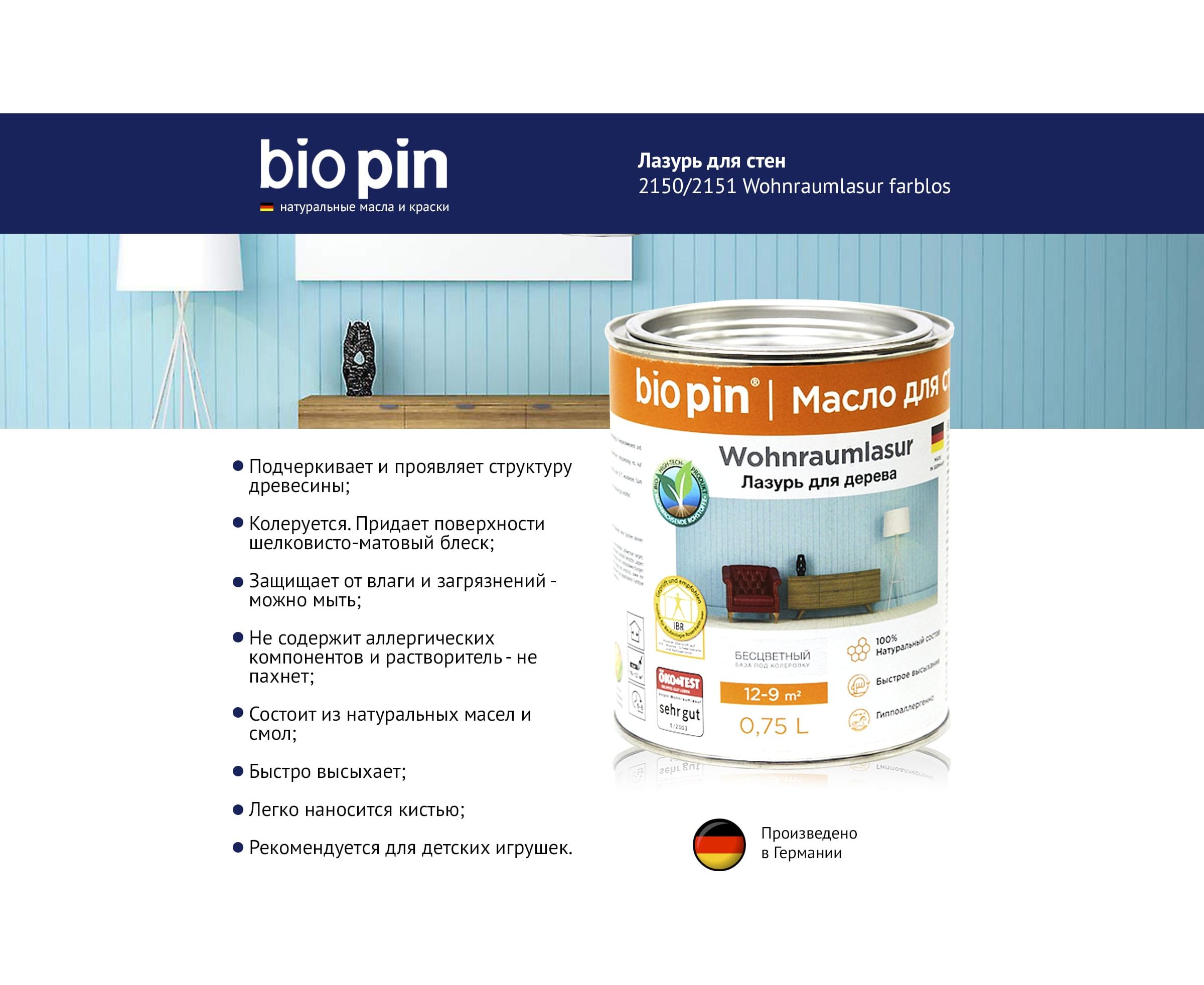 Лазурь для стен BIO PIN 2151 Wohnraumlasur СВЕТЛО-БИРЮЗОВЫЙ 0.75 л 21511H202 глубоко проникает в древесину, защищает от влаги и загрязнений, позволяет дереву дышать.