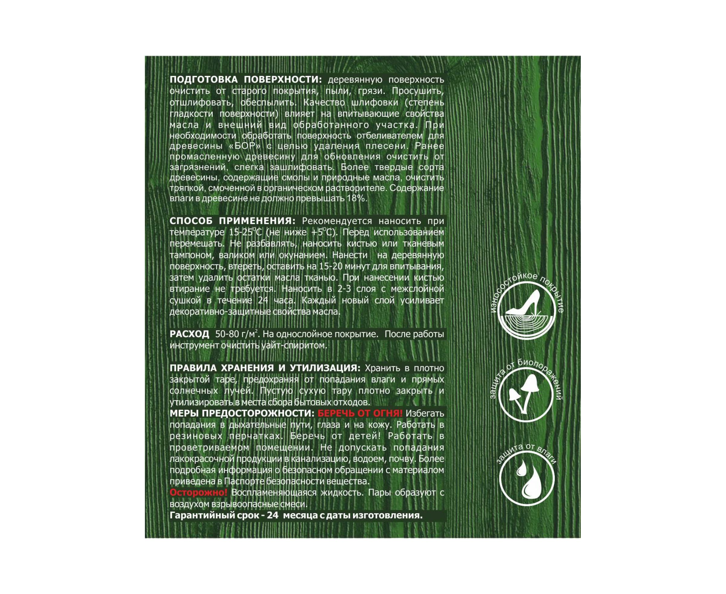 Масло глубоко проникает в поры древесины, тем самым препятствует набуханию и растрескиванию. Обработанная маслом поверхность отталкивает воду и грязь. Комплекс защитных добавок предотвращает появление плесени и синевы, защищает древесину от насекомых-вредителей. Покрытие со временем не шелушится и легко обновляется. Достаточно повторно нанести некоторое количество масла на участки, требующие обновления.
