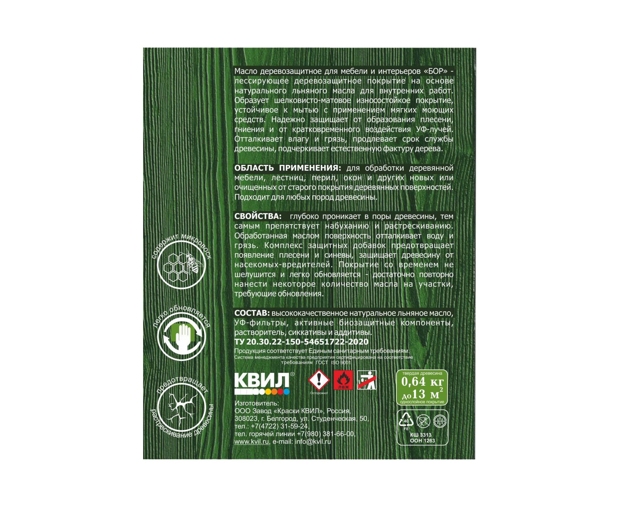 Деревозащитное масло для мебели и интерьеров Бор орех, банка 0,64 кг 4690417074259 предназначено для защитно-декоративной отделки изделий из всех видов древесины, эксплуатируемых внутри помещений. Используется для обработки деревянной мебели, лестниц, перил, окон и других новых или очищенных от старого покрытия деревянных поверхностей.
