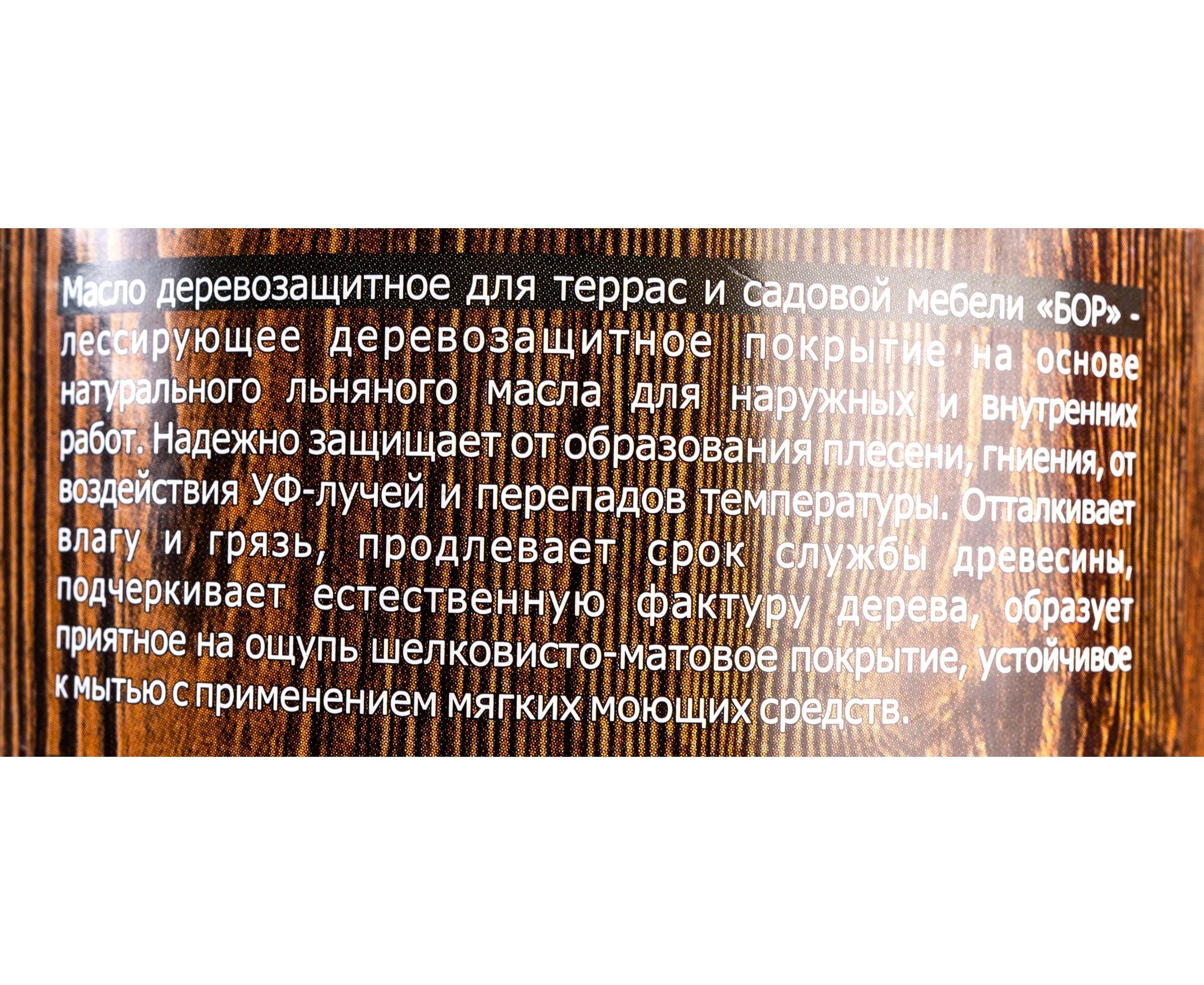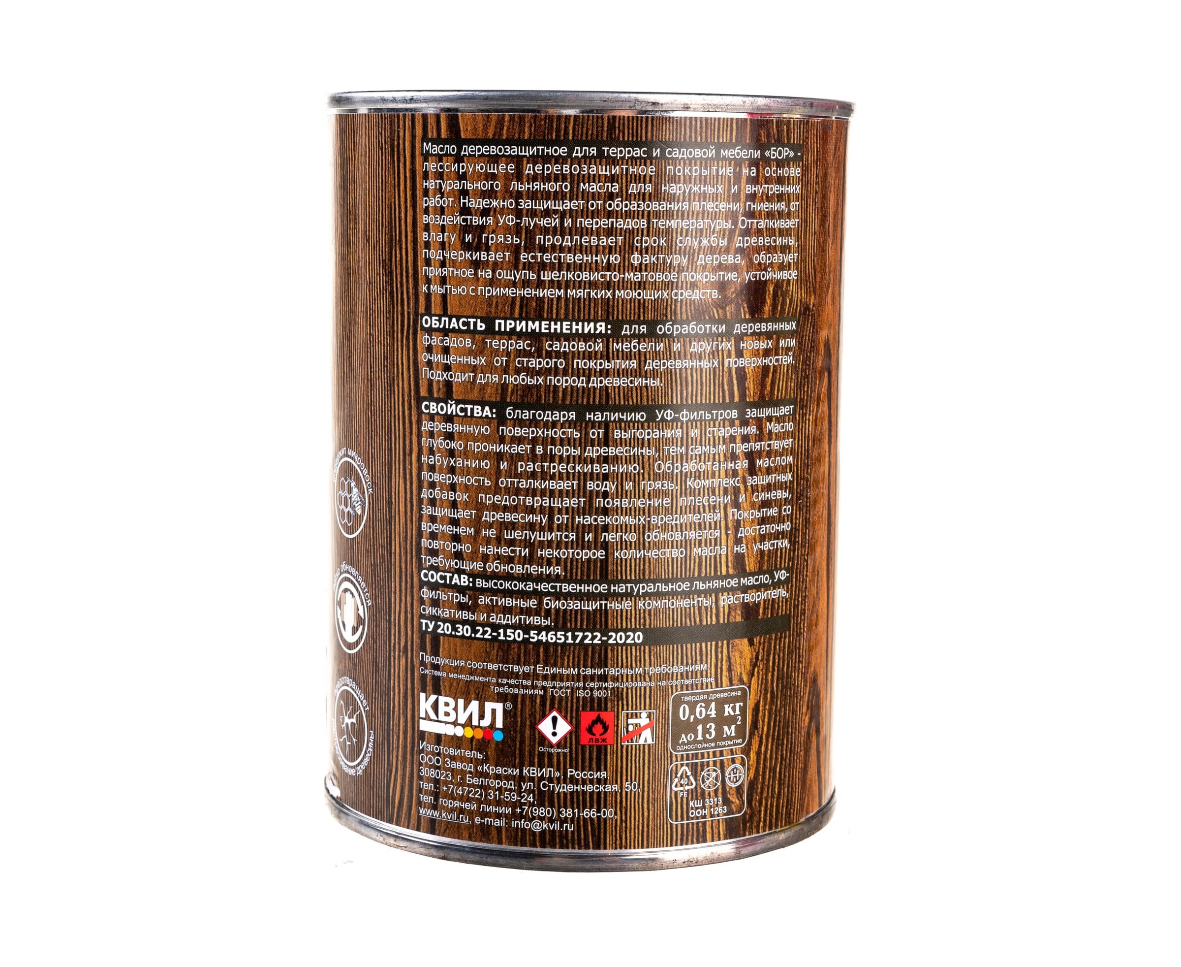 Деревозащитное масло для террас и садовой мебели Бор орех, банка 0,64 кг 4690417061471 предназначено для защитно-декоративной отделки изделий из всех видов древесины, эксплуатируемых внутри помещений, а также в атмосферных условиях. Используется для обработки деревянных фасадов, террас, садовой мебели и других новых или очищенных от старого покрытия деревянных поверхностей.