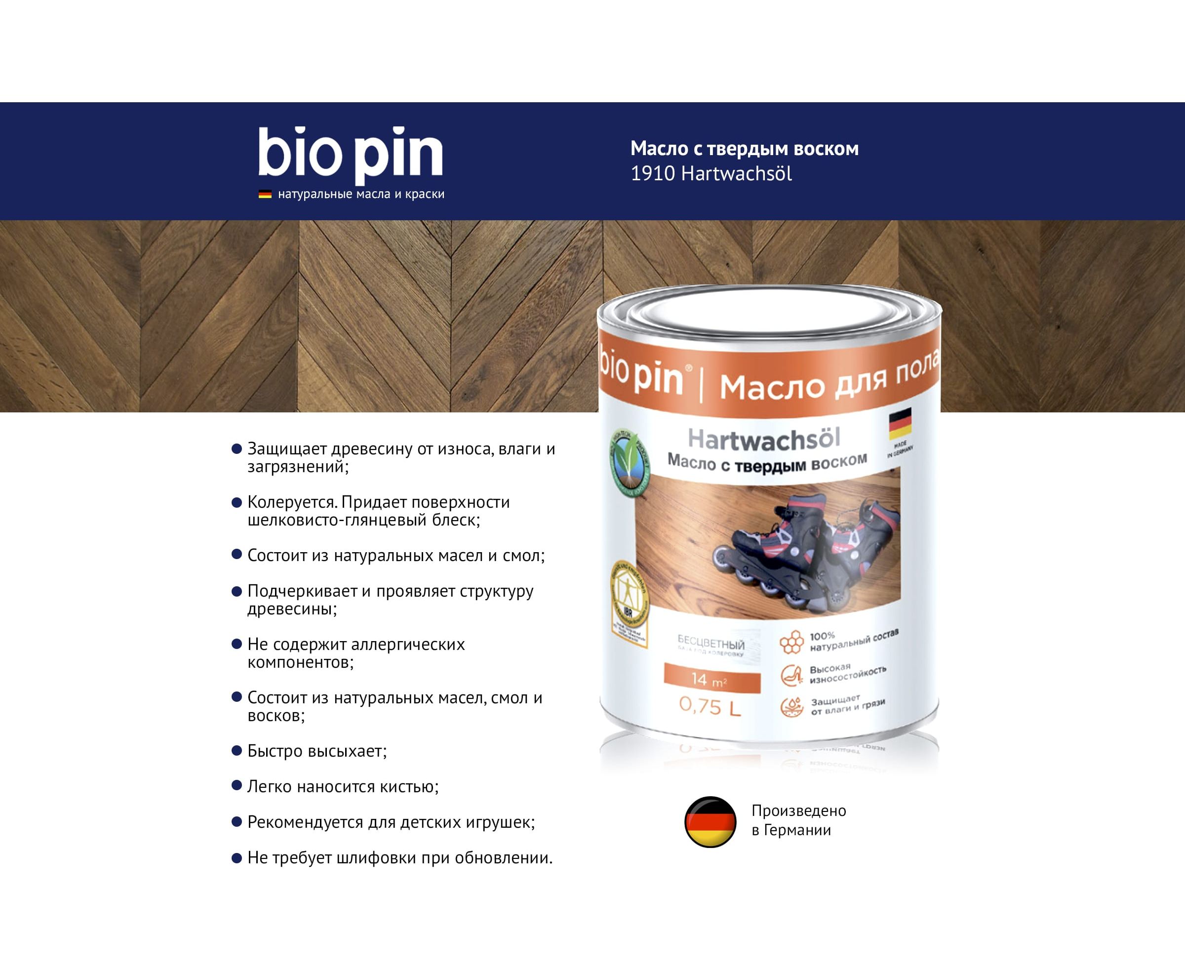 Масло для пола с твердым воском BIO PIN 1910 Hartwachsol в цвете прозрачный темно-янтарный 0.75 л 19101F101