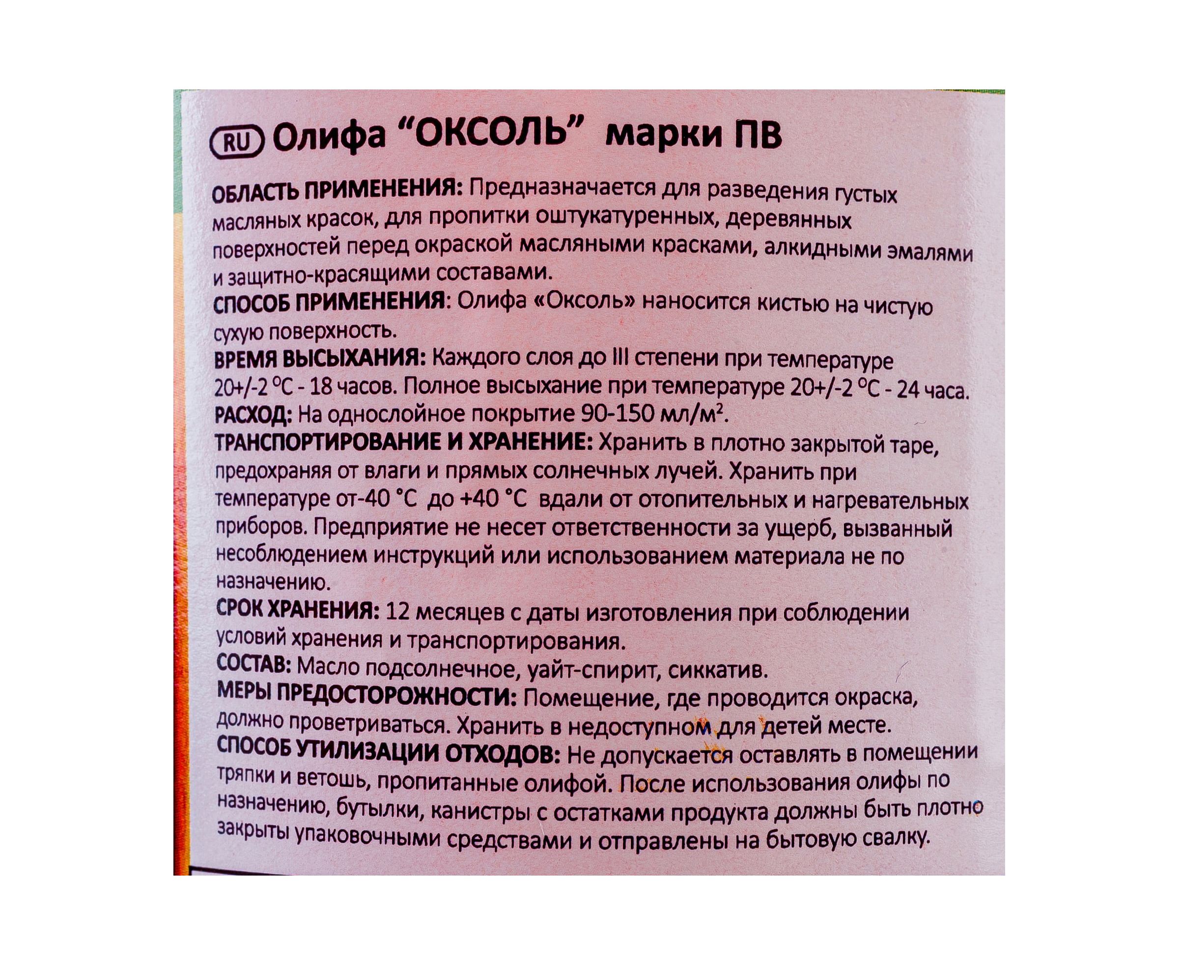 Олифа FARBITEX Оксоль марки ПВ 1 л 4300005041 предназначена для разведения густых масляных красок, для пропитки оштукатуренных, деревянных поверхностей перед окраской масляными красками и алкидными эмалями. Защищает деревянные поверхности от различных негативных воздействий: предотвращает появление грибка, плесени, защищает от насекомых. Применение олифы позволяет значительно увеличить срок службы поверхности. Расход 90-150 г/кв.м.