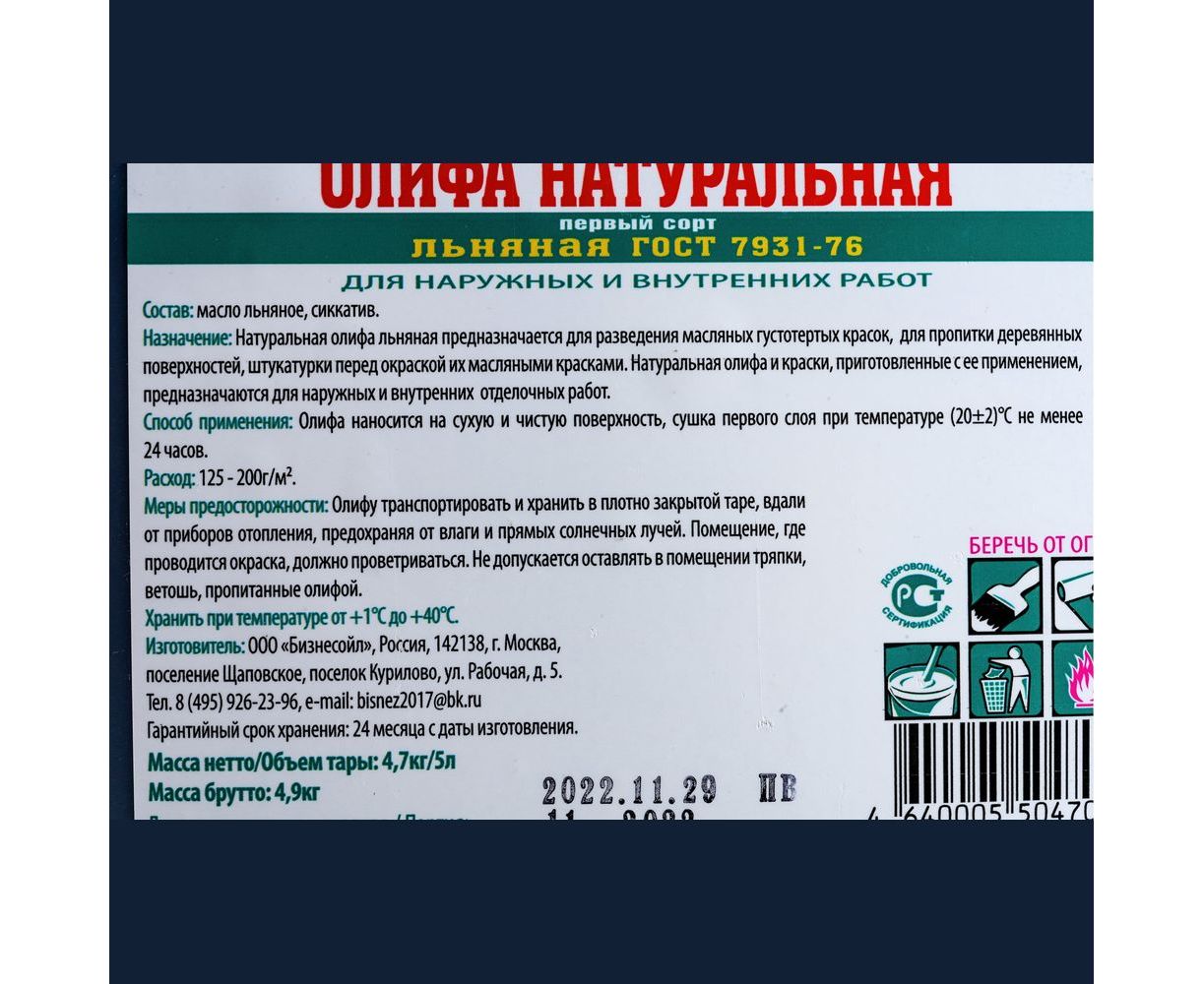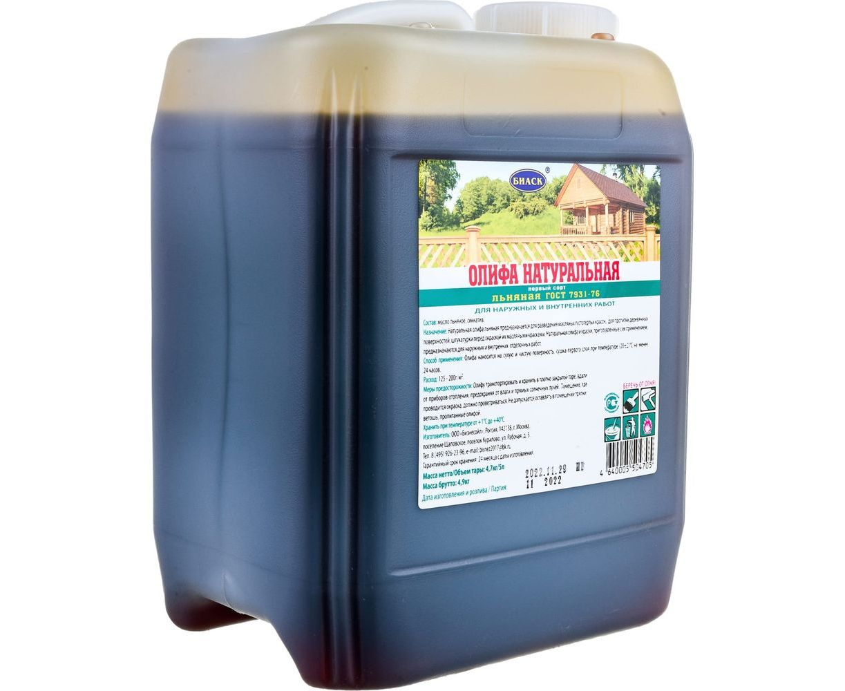Олифа натуральная льняная ГОСТ 7931-76 БИАСК ОЛ-5/4,7кг ПК состоит из 97% льняного масла и 3% ускорителя сушки.
