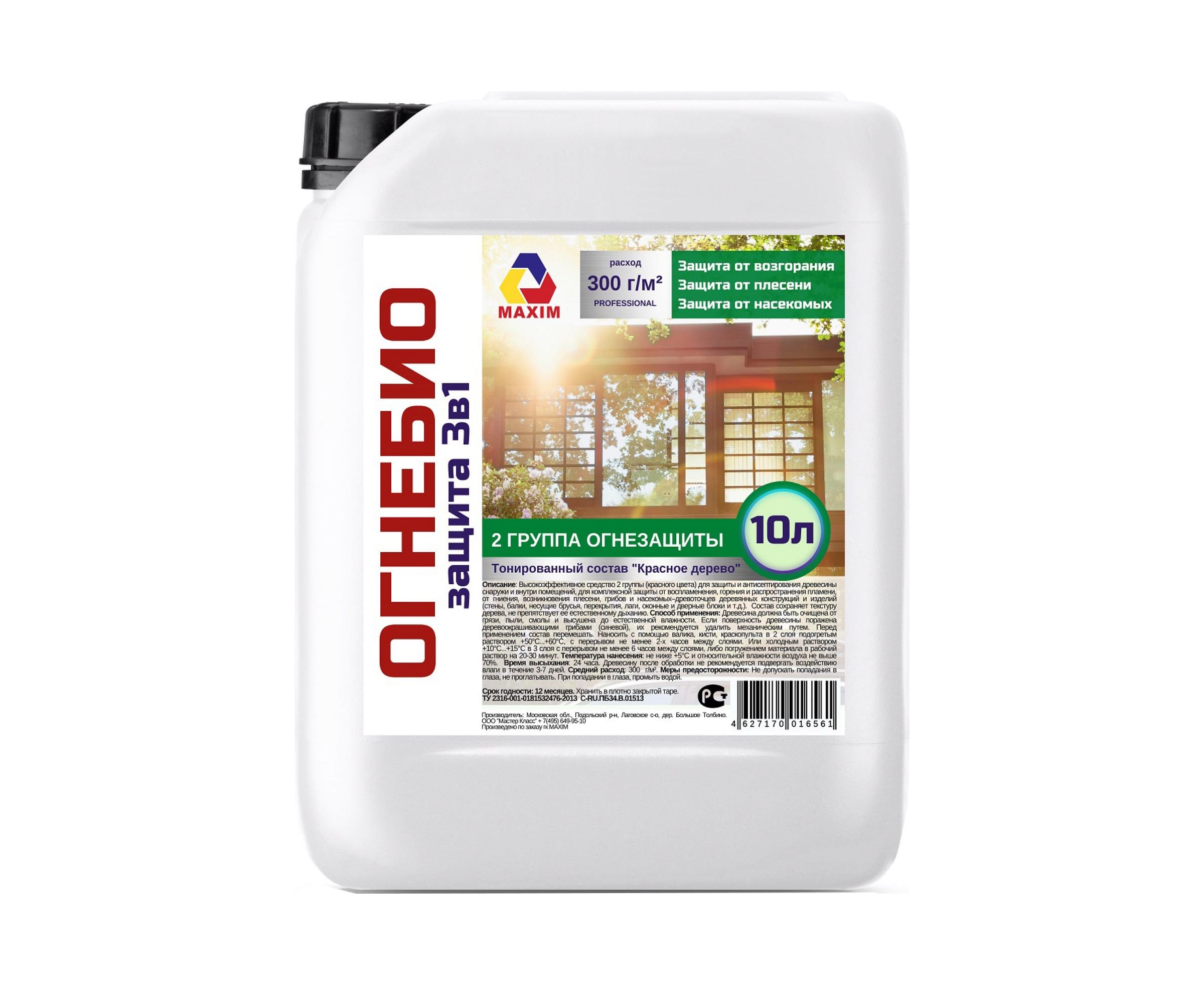 Огнебиозащита 2 группы тонированная Maxim 10 л 11606710 - это эффективное средство 2 группы (красного цвета) для защиты и антисептирования древесины снаружи и внутри помещений, для комплексной защиты от воспламенения, горения и распространения пламени, от гниения, возникновения плесени, грибов и насекомых–древоточцев деревянных конструкций и изделий (стены, балки, несущие брусья, перекрытия, лаги, оконные и дверные блоки и т.д.).
