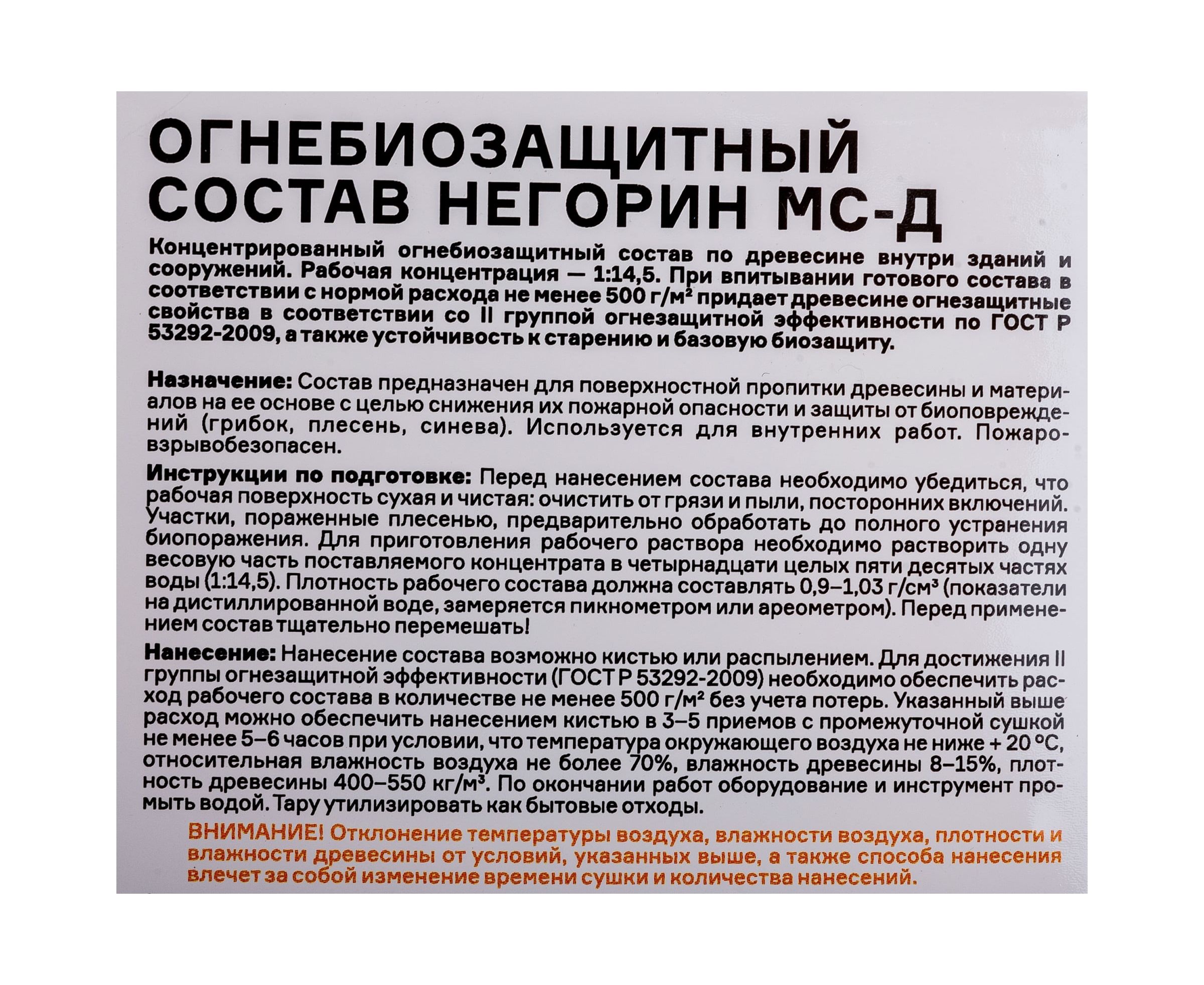 Огнебиозащита Woodstock НЕГОРИН-МС-Д концентрат 1:14,5 1 кг (15,5 кг готового состава) ТД000003767 применяется внутри сухих помещений. Продукт защищает деревянные конструкции от биологического воздействия (грибок, плесень), а также снижает их пожароопасность (2 группа).