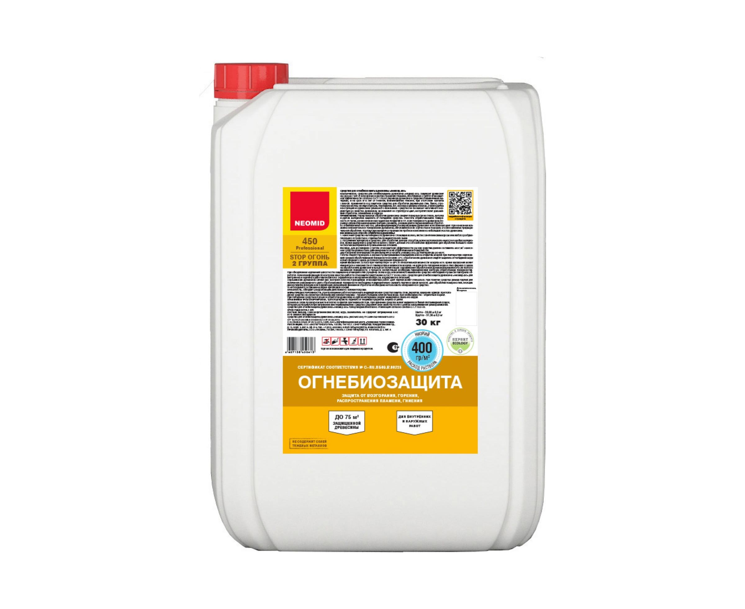 Огнебиозащитный состав тонированный NEOMID Неомид 450 - 2 группа (30 кг) Н-450(2)-30/тон. защищает древесину на срок до 7 лет от возгорания и распространения пламени, обеспечивая II группу огнезащитной эффективности согласно ГОСТ Р 53292 (переводя древесину в трудновоспламеняемый материал), и на срок 8-10 лет от гниения, возникновения плесени, при отсутствии контакта с влагой. Применяется как защитная пропитка для обработки деревянных стен, балок, стропильных систем, несущих брусьев, перекрытий, лаг, оконных и дверных блоков, а также других конструкций из древесины различного назначения.